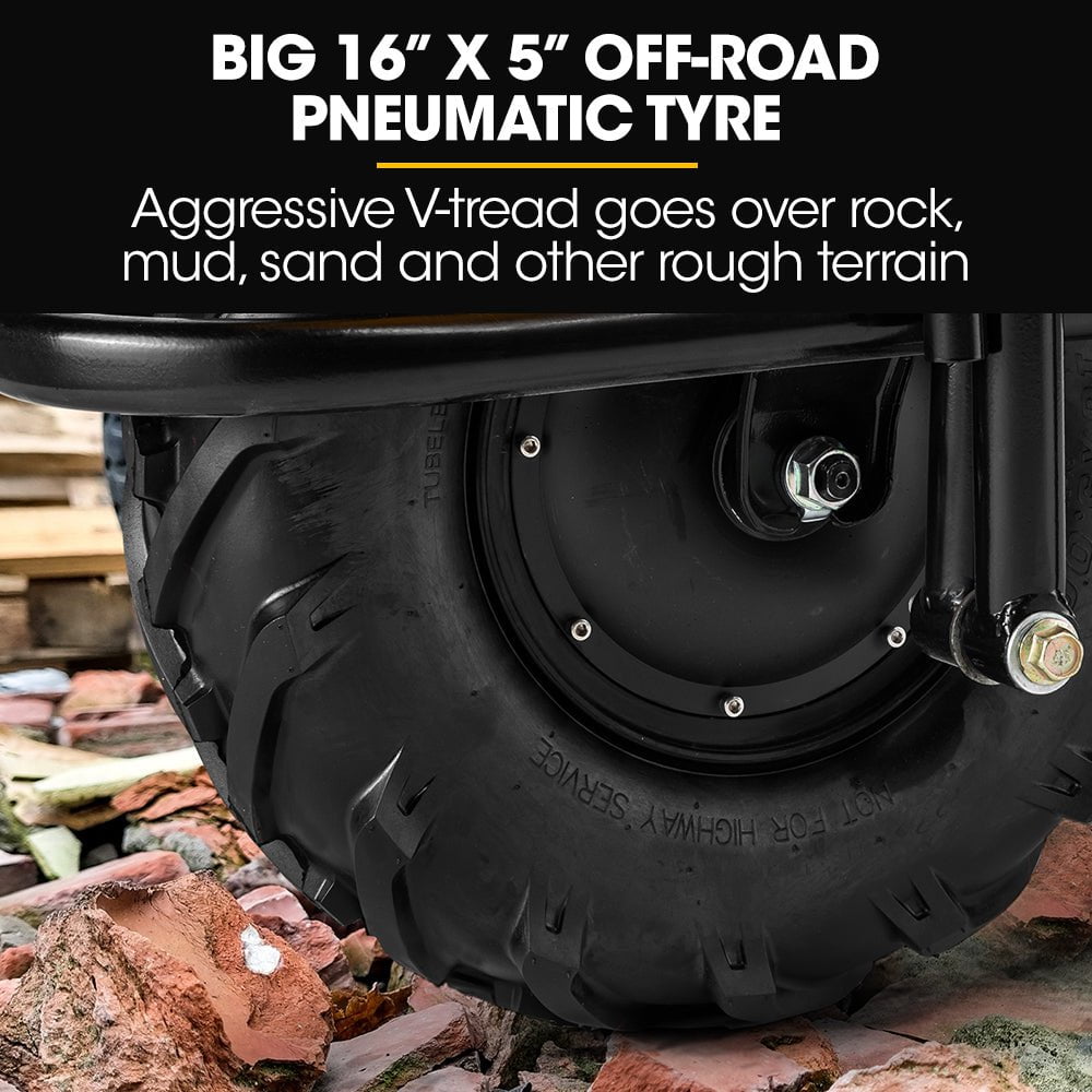 The deep 16" x 5" inch aggressive deep V-tread front tyre provides superior traction and drive. The large 10" rear tyres can handle rough terrain in gardens, on worksites and makes moving material over long distances easy. The drive wheel has an electronic brake to ensure stability and control - and makes emptying easy!