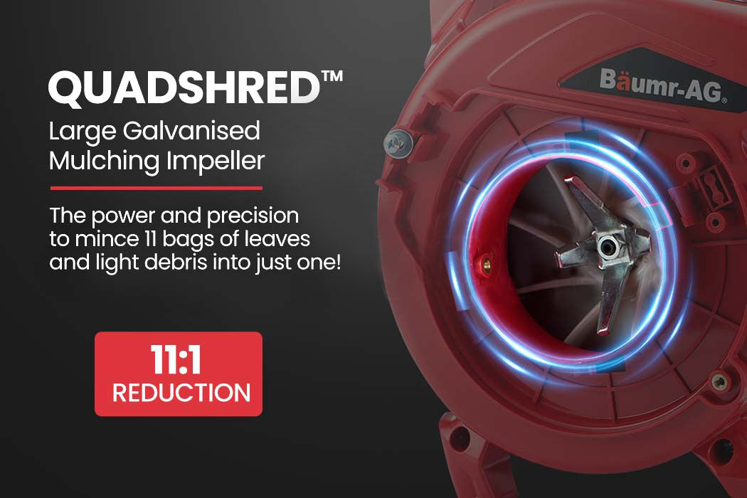 The QuadShredgalvanised impeller mulches leaves and light foliage so finely that you can fit 11 times as much into the large 50L shoulder strap bag! Plus, emptying the bag takes no time thanks to the full length zipper.