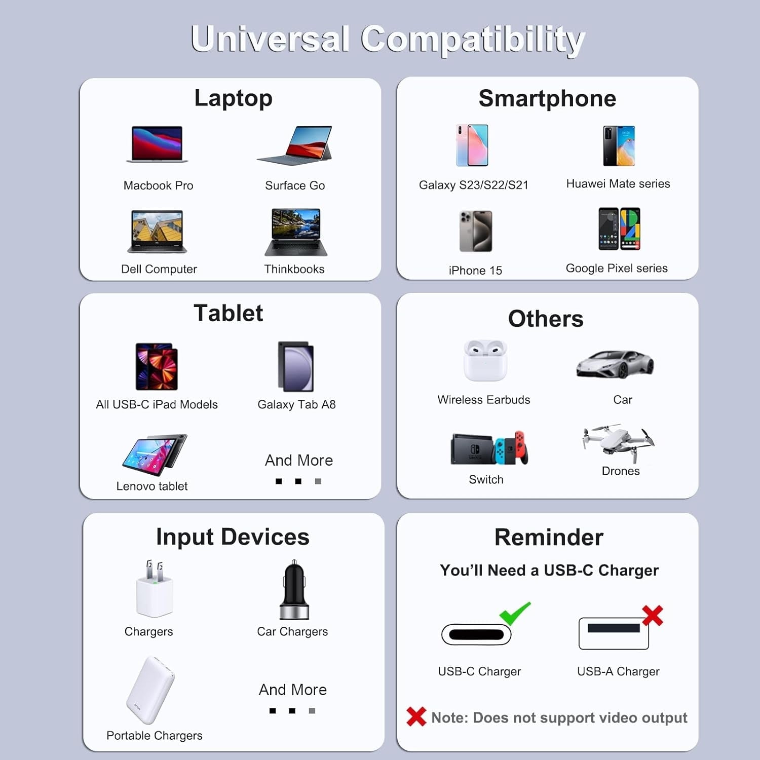 Supports a max power output of 100W when paired with a 100W or above wall charger to power up virtually any USB-C device, including phones, tablets, and laptops. (This cable does not support media display.)