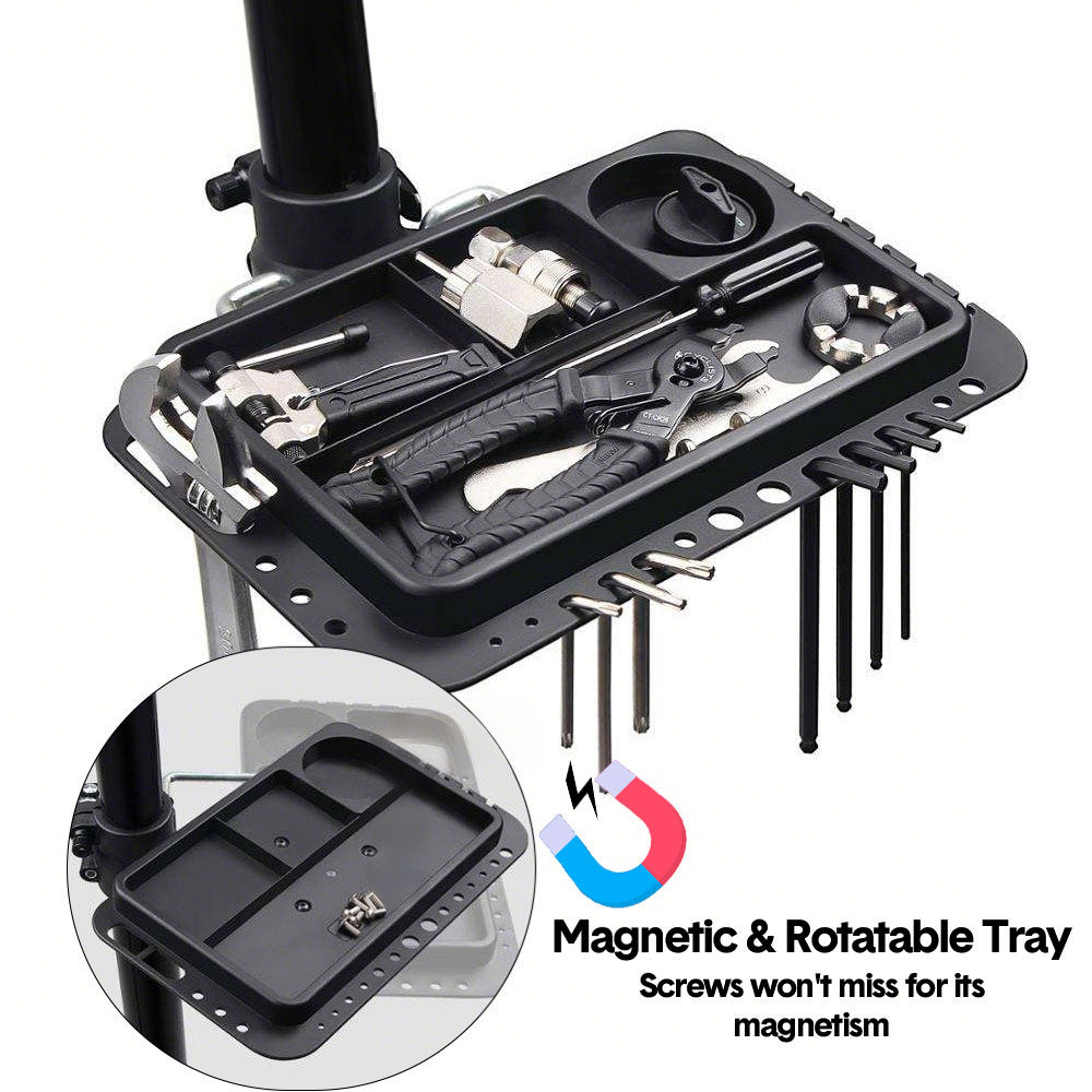 Built with premium steel tubing and reinforced plastic, this bike repair stand supported by 2 widened legs, can be adjusted and locked to form a triangular reinforcement that significantly improves overall stability while a detachable tool tray keeps your repair tools organized and within reach. Quick-release allows for fast setup and takedown.
