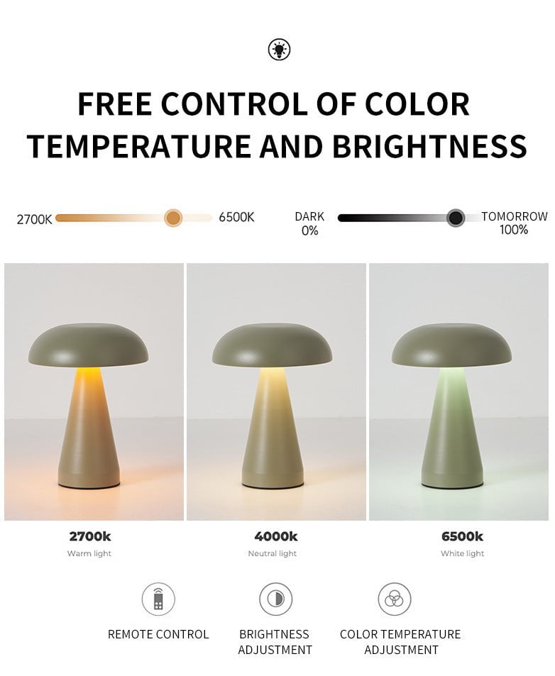Transform your living space with this Metal Mushroom Table Lamp. Designed with a sleek, modern mushroom shape, this rechargeable ambient light is perfect for living rooms, restaurants, bars, or as a stylish bedside night light. Featuring touch control and a remote, it offers customizable color temperatures and brightness levels to suit any mood or occasion.