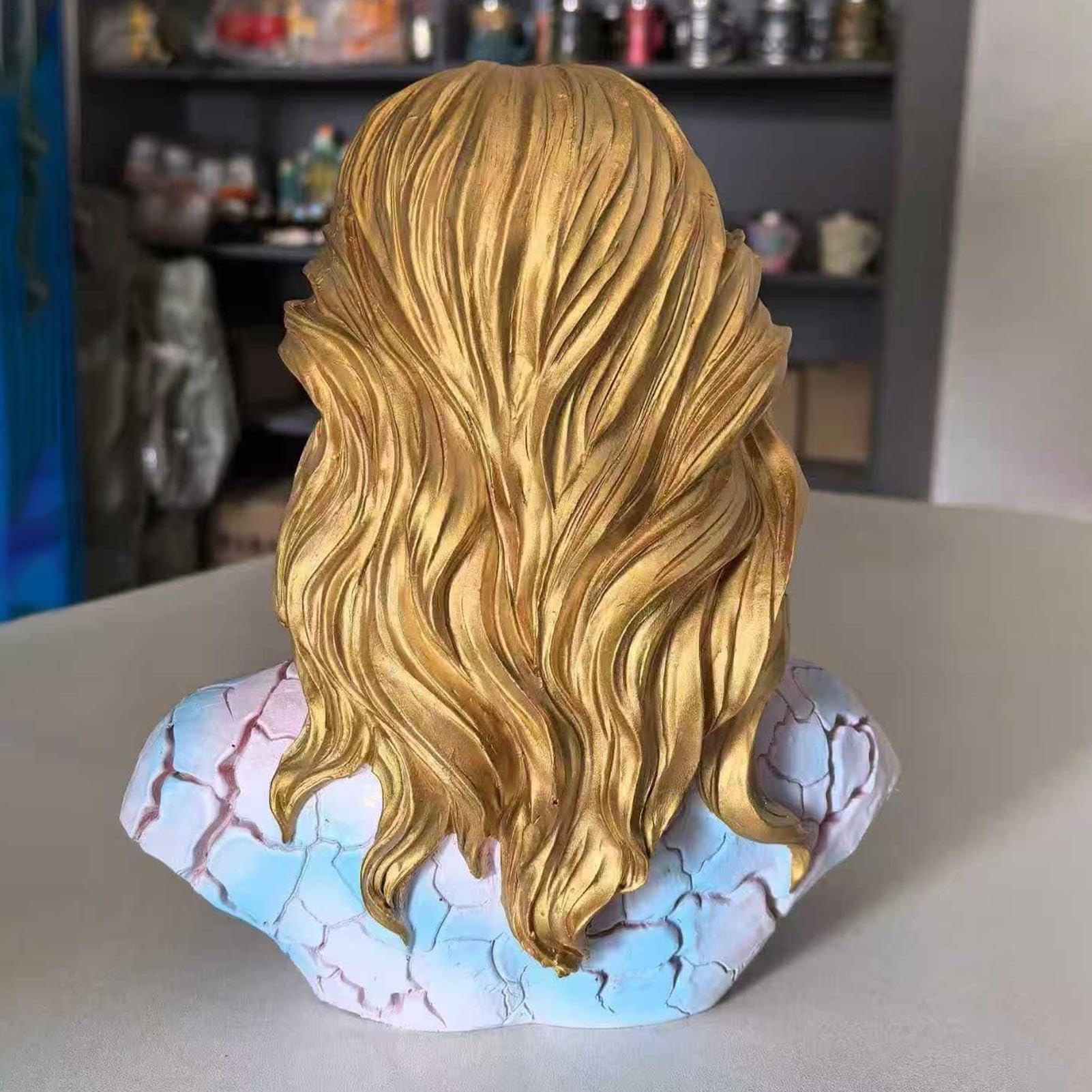 - Artistic Design: Features a detailed female bust with golden hair and crackled surface that emits glowing light.