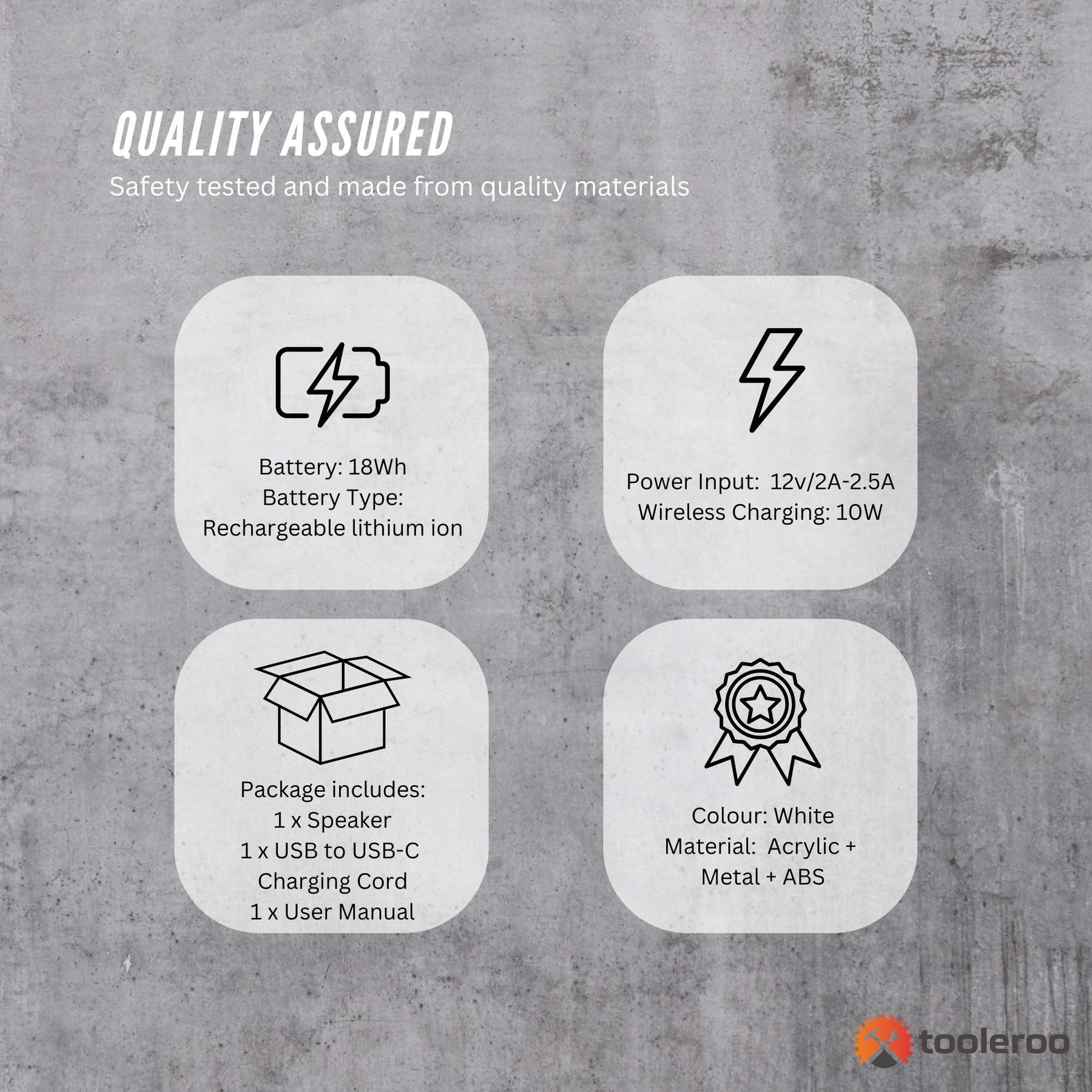 Upgrade your audio experience with this versatile LED Wireless Charging Speaker. Whether you're setting the mood with ambient lighting, charging your devices, or enjoying your favourite music, this all-in-one device has you covered. The rechargeable battery makes it portable and perfect for any room in your home or to take with you, it combines functionality and style to enhance your everyday life.