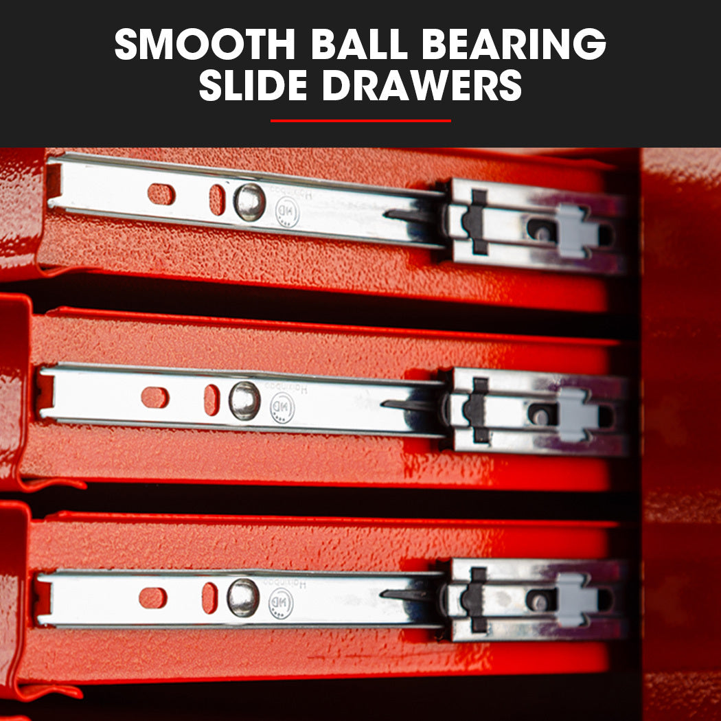 This toolbox features a lower cabinet, which is suitable for bulkier tools. Each drawer is equipped with an EVA mat and it slides effortlessly in and out on smooth ball bearing rails.