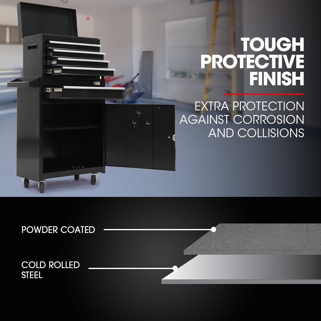 Both the cabinet and chest are built with high tensile powder coated steel enclosures. Equipped with an EVA mat, each drawer slides effortlessly in and out on smooth ball bearing rails, which makes finding and accessing each tool a cinch. The cabinet also comes with 3 pegs and the chest is easily transportable thanks to its side carry handles.