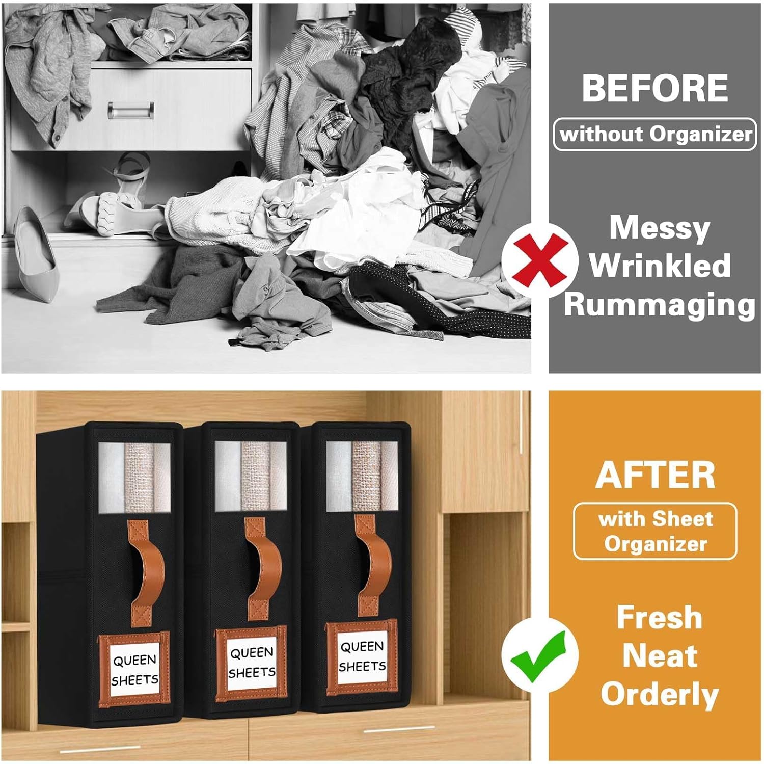 PREMIUM MATERIAL & REINFORCED DESIGN: Crafted from durable, odorless fabric with reinforced cardboard panels, this organizer keeps its shape even when fully packed. The PU leather handle offers a comfortable grip, making it easy to slide in and out of closets without bending or collapsing.