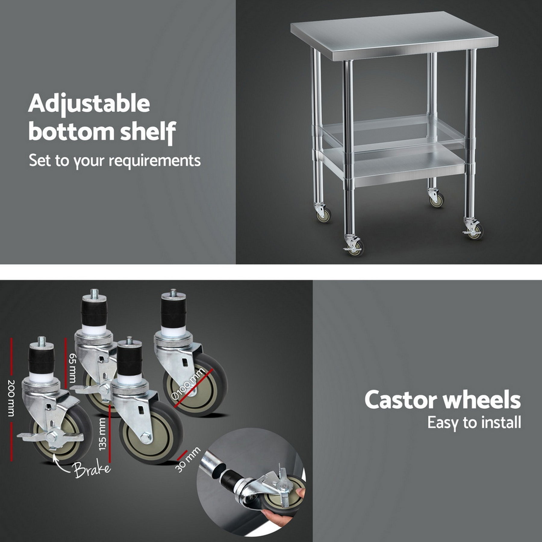 This Cefito Stainless Steel Work Table is a versatile and heavy-duty stainless steel prep table for any commercial or home kitchen. Constructed from 430 food-grade stainless steel, it ensures hygiene and durability. The upper bench boasts a 160KG load capacity, perfect for all your tasks. Featuring an adjustable undershelf for convenient storage and adjustable plastic bullet feet. This stainless steel kitchen bench with undershelf is built for reliable performance.