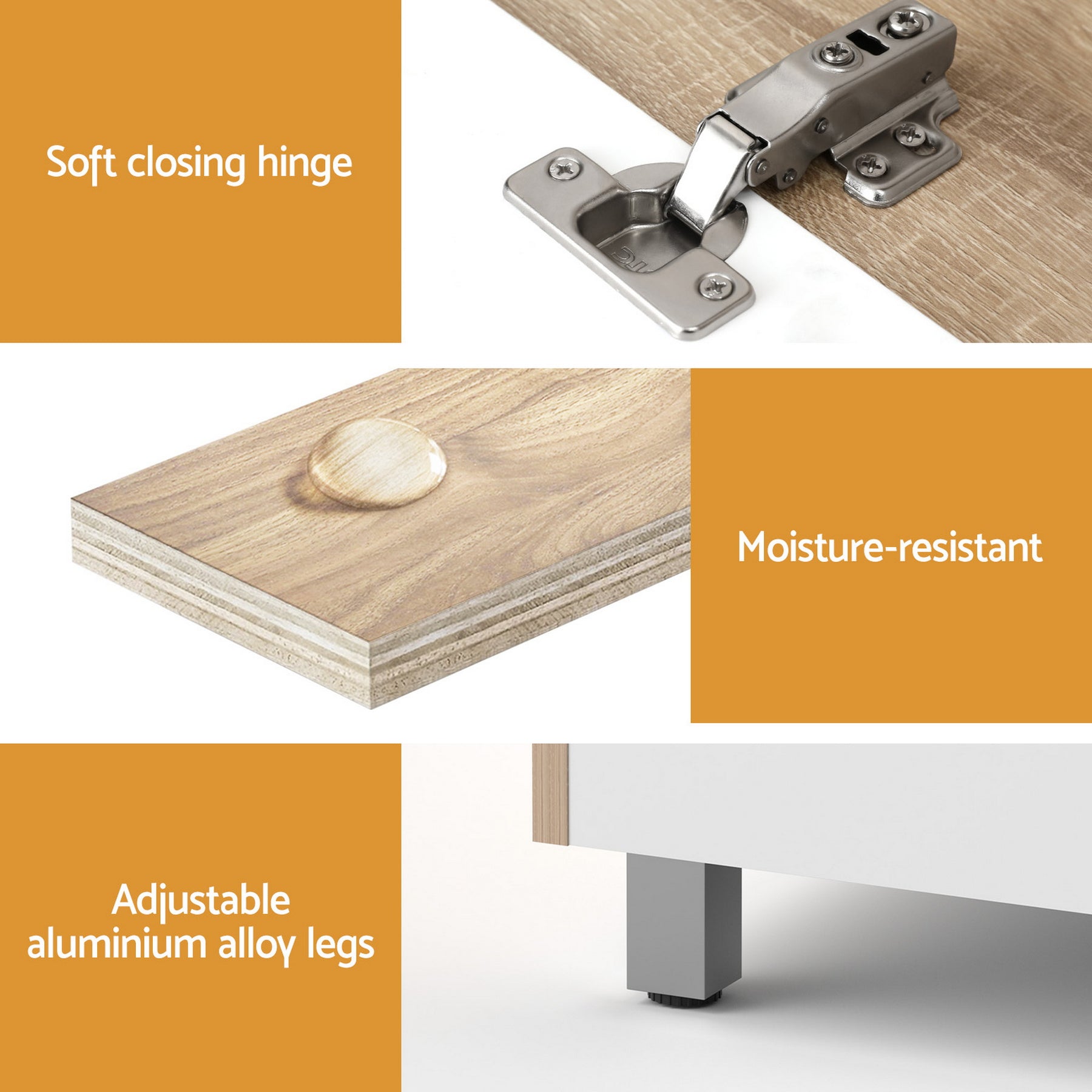Made from quality 15mm particle board, this cabinet is moisture-resistant and built for long-lasting use. Its two-tone design, paired with a crystalline ceramic basin, adds a sophisticated touch to any bathroom. The cabinet offers practical storage with closed and open shelves for all your essentials, while the handle-free matte white door with soft closing hinges ensures a seamless and quiet experience. The adjustable aluminium alloy legs provide stability on uneven surfaces, making it adaptable to your space. Easy to install and clean, this bathroom vanity is the perfect addition to your home.