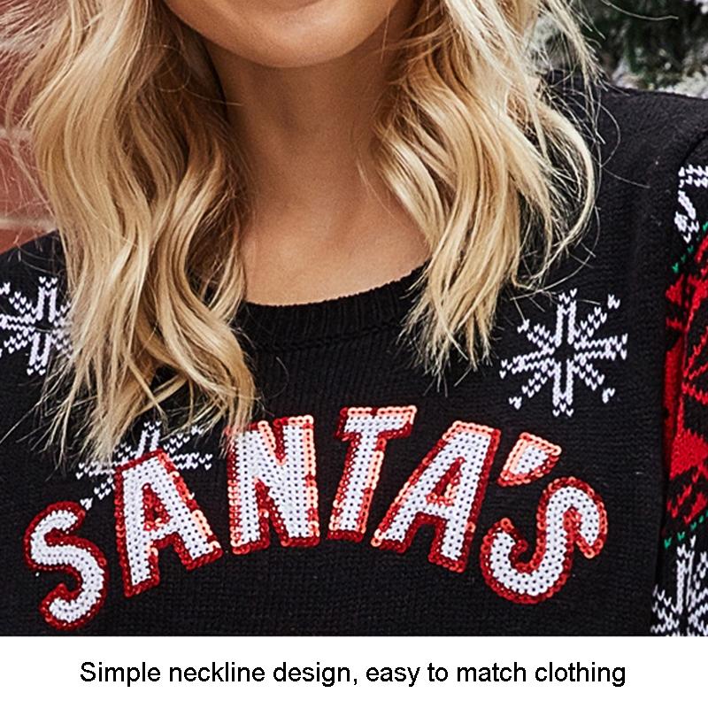 Christmas Women Pullover Sweater Santa Claus Embroidery Crew Neck Knit Sweater - Black - S