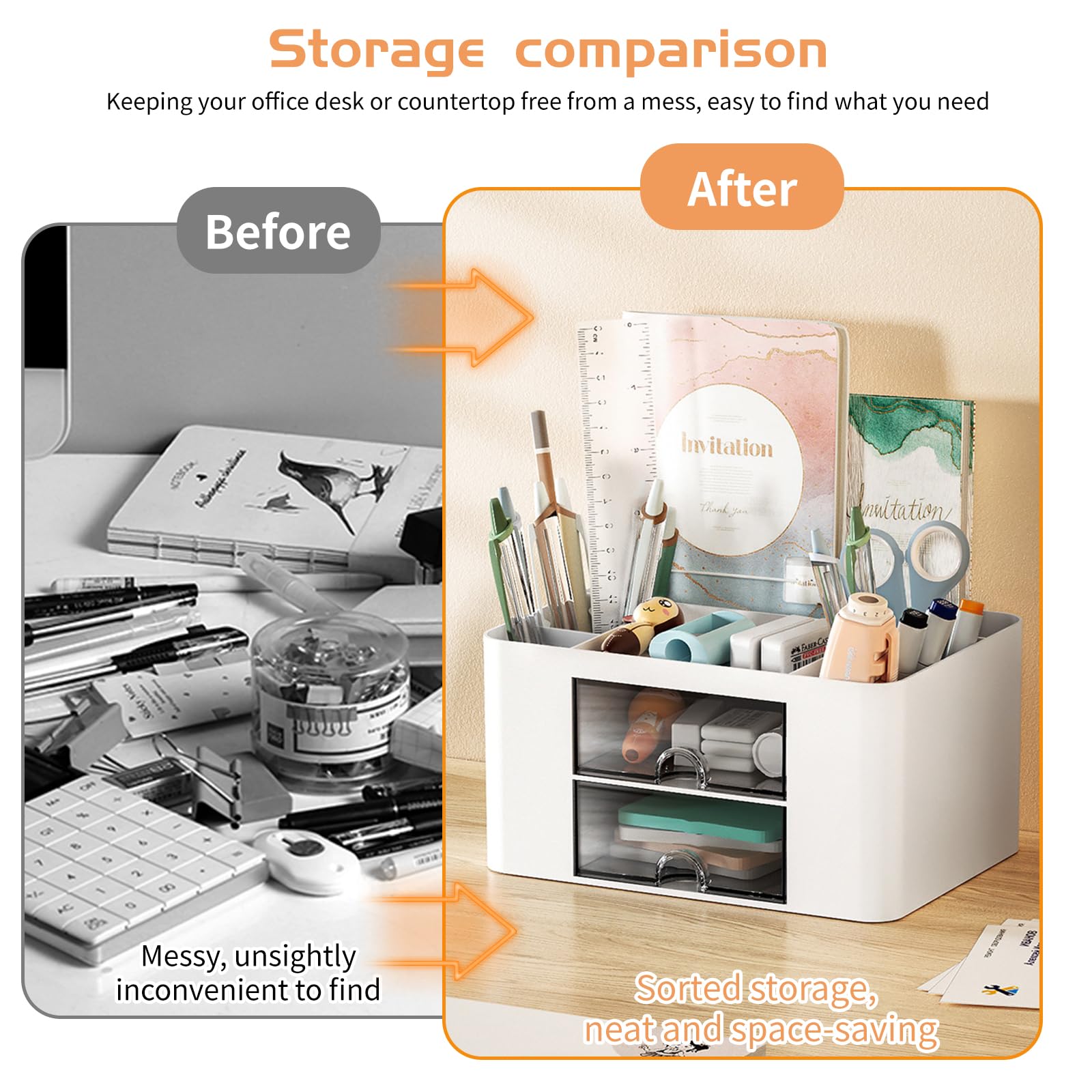 Multifunctional DesignThis desk organizer features 2 drawers and 5 spacious compartments and no assembly required. It provides ample storage space for all your school supplies. Keep everything organized and within reach, improving your productivity.