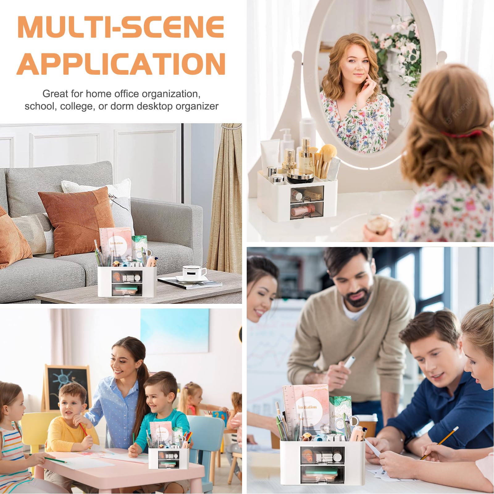 Multifunctional Desk AccessoriesIdeal storage space for your desk. Suitable for small stationery and sticky notes. Perfect for scissors, tape, staplers, USB flash drives, rubber bands, white paper, rulers, pens, pencils, paper clips, push pins, highlighters, markers, and glue. Also suitable for craft supplies, paintbrushes, and household tools. Ideal for storing reading glasses, cosmetics, makeup, jewelry, lipstick, cell phones, keys and business cards.