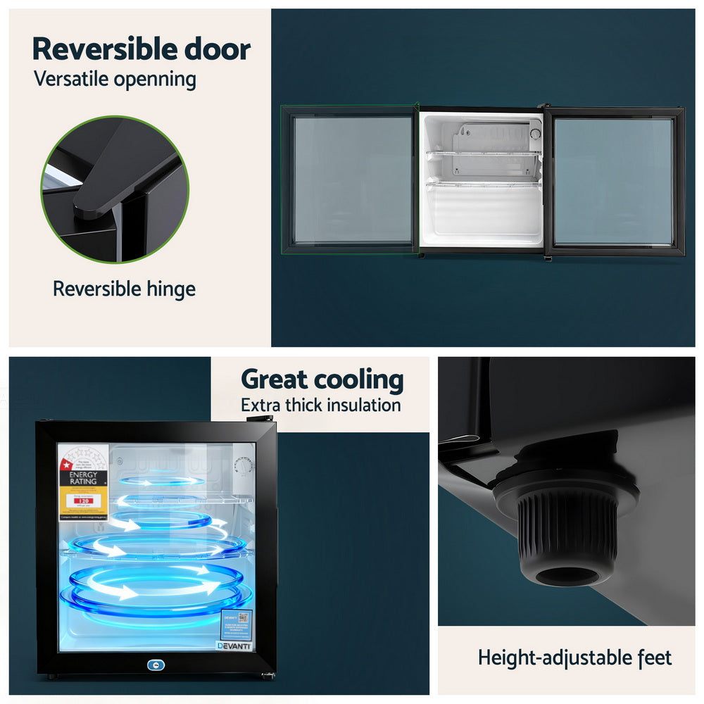 Our portable Devanti Bar Fridge is great for keeping a variety of food and beverages chilled and cooled without taking up too much space. Designed with six temperature settings, the energy-efficient bar fridge lets you set your desired coolness and freshness. Other great features include adjustable shelves, double-glazed door, height-adjustable feet, built-in handle and consistent refrigeration to name a few. The compact bar fridge is well-made for robust use, such as the extra thick insulation and a built-in LED lamp to ensure operation is smooth, quiet and hassle-free. This versatile countertop fridge can also be used as a freestanding unit.An ideal mini fridge for any space.