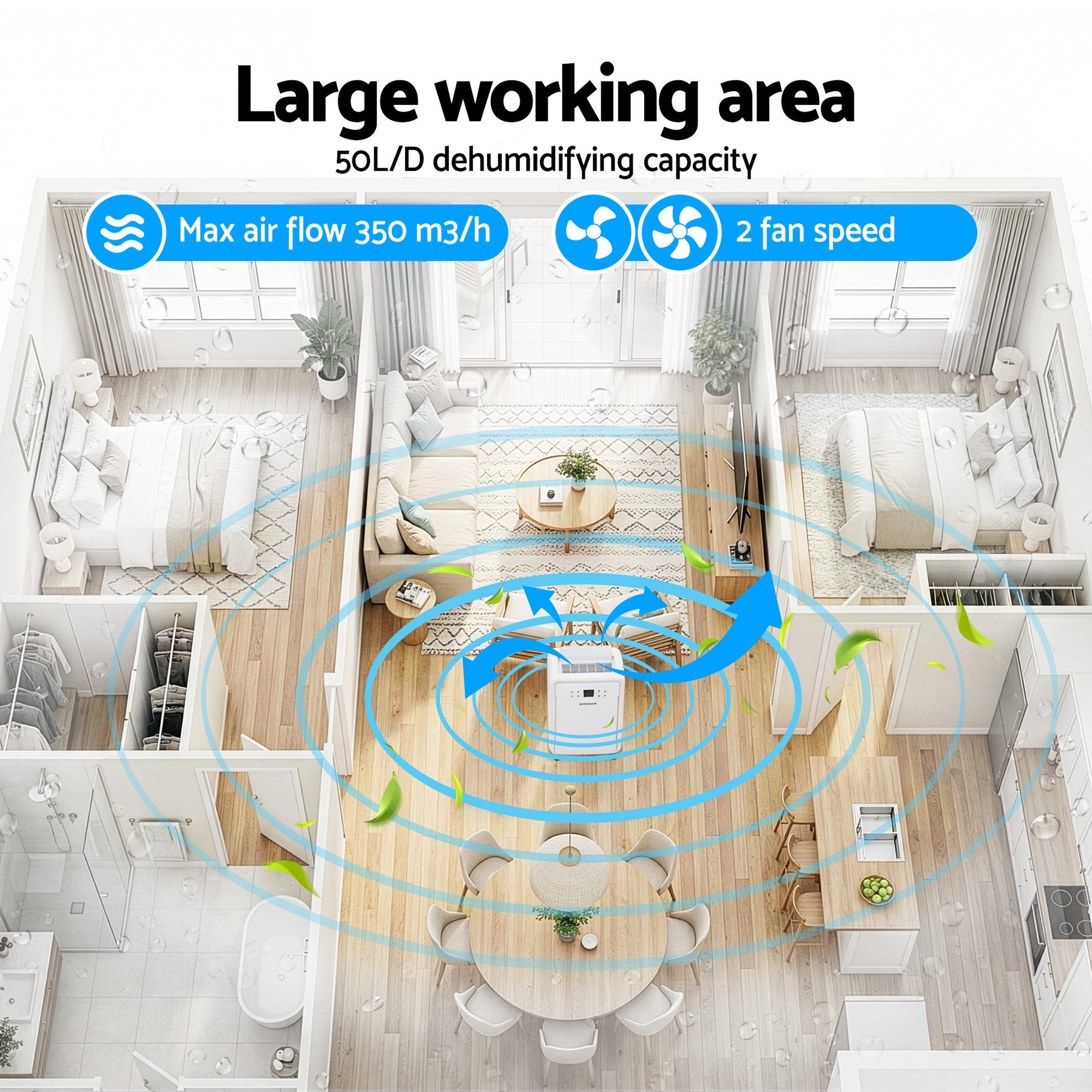 Combat moisture and mould with the Devanti 50L Dehumidifier. Designed for large spaces, this powerhouse extracts up to 50L/day and features a dedicated Laundry Mode for fast indoor drying. It boasts a massive 8.5L tank, 24h timer, and quiet Sleep Mode (≤47dB). Control humidity easily via the smart touch panel or use the included hose for continuous drainage. Built with easy-roll castors for mobility, it offers industrial-strength drying for your home.