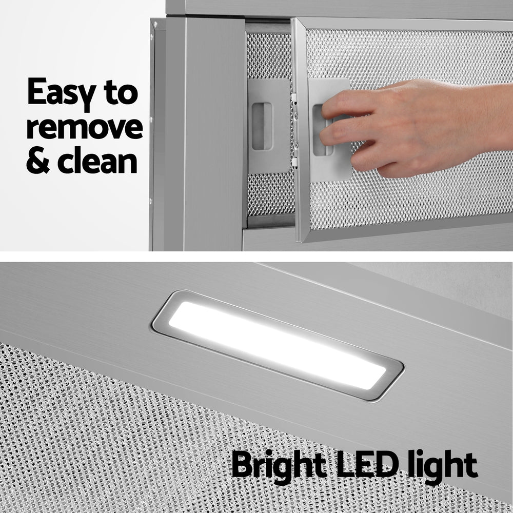 Do you suffer from stifling odours and stubborn smoke or steam from your cooking? Say goodbye to smells and stains with the Devanti 90cm Slide-out Range Hood. Made from Grade A stainless steel the range hood looks and functions perfectly for a busy kitchen. Featuring a powerful extraction rate of 160m³/hr from a high-performance motor, our stainless-steel range hood will clear the air of smoke, steam, odours and vapours in no time. The non-stick and removable 3-layer aluminium grease filter ensures all grease is efficiently captured. Clear and bright LED lights provide vivid illumination for your cooking area, so you can see everything you're cooking. Completing the job is a 2-speed fan that can be easily selected with the push button controls. The range hood is easy to install and suitable for standard Australian plugs and both under-cabinet or wall-mounted installation. For clean and clear air in your home, you can't cook without a Devanti Slide-out Range Hood.