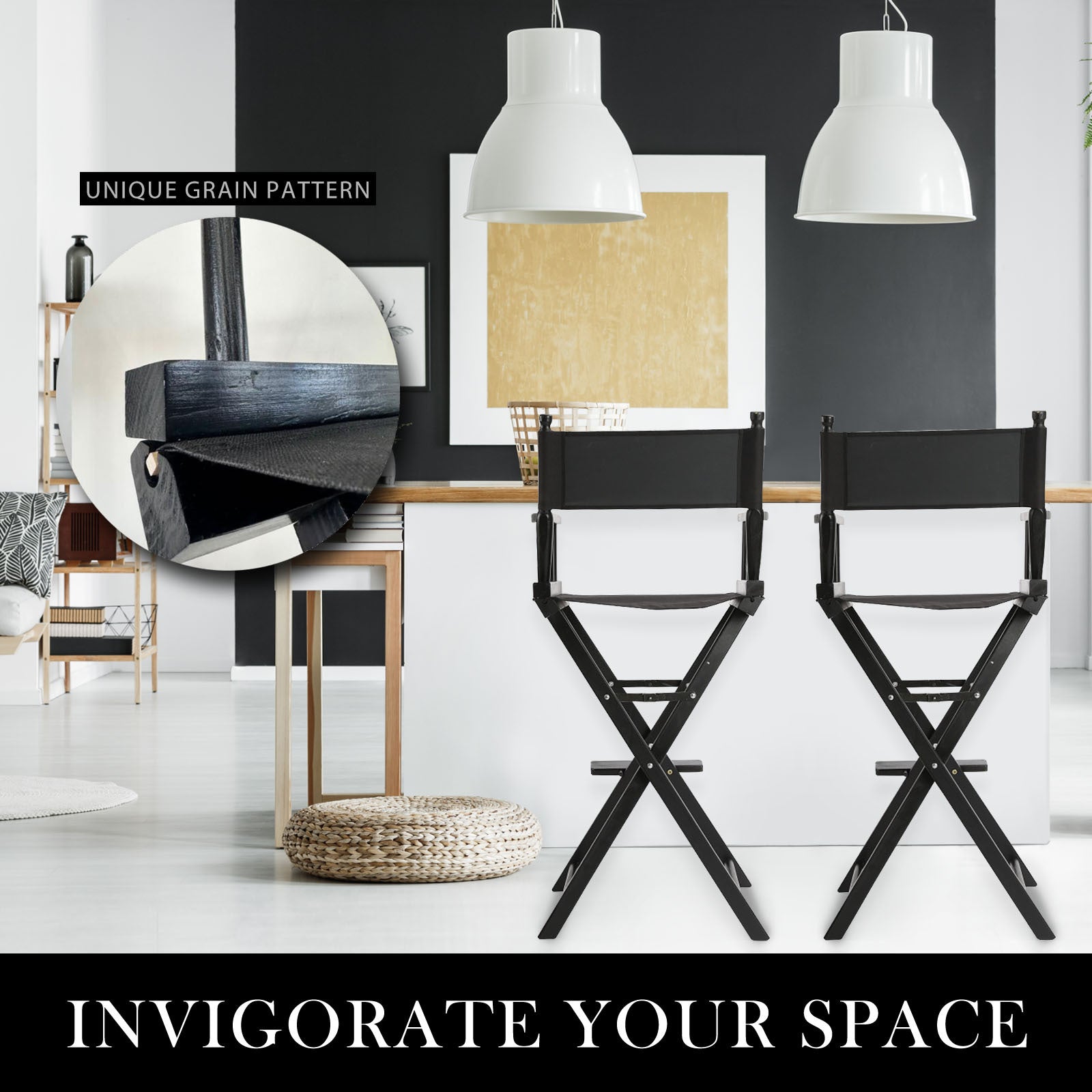 Crafted from durable beech wood with a glamorous black finish, it adopts high-strength material and delicate workmanship to ensure excellent quality and durability. The snag-resistant backrest and seat are made of heavy-duty 600D Oxford fabric for all-weather use and can be easily removed for cleaning. Foldable design makes it room-saving when not in use; and also convenient for carrying. It is equipped with a footrest for comfort. Besides, there are two detachable side bags and large storage for your beverages or work essentials. It is really ideal for makeup! And when it's a wrap, just fold the lightweight Chair away for easy transport or storage.