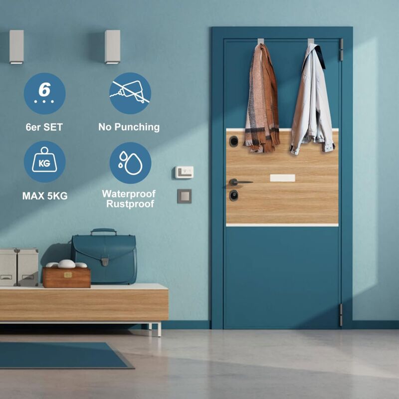 There are no burrs on the edges and there are no scratches when hanging items.BOXLUNT Over the Door Hooks Set of 6 - Coat Rack for Door - Coat Hooks - Coat Hook - Door Hook - Stainless Steel Waterproof and Rustproof, Durable for Kitchen, Bathroom, Hallway and BedroomTransforms your door into extra storage spaceEverything is fine!Over the door hooksOver the door hooks are simple but ideal helpers for tidying up the entire apartment.Over the door hooksIt is also an economical and space-saving addition to wardrobes and closets.Over the door hooksUse over the door hooks wherever you need them.
