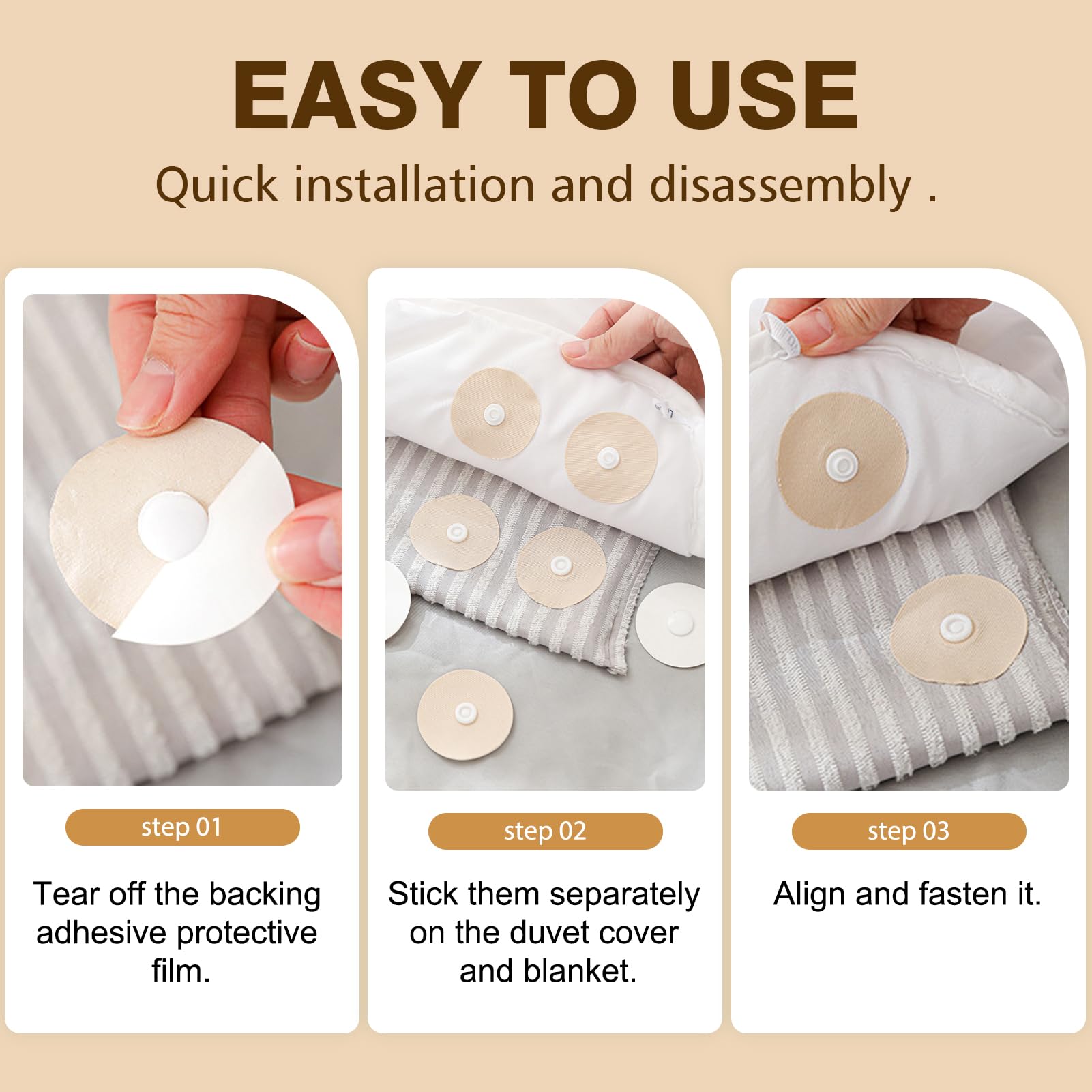Easy to Use Quick and damagefree installation. Simply remove the protective film from the base, attach it to your bedding, align, and snap the duvet cover clip into place. No tools, no sewing, no holes in the fabric. True convenience.
