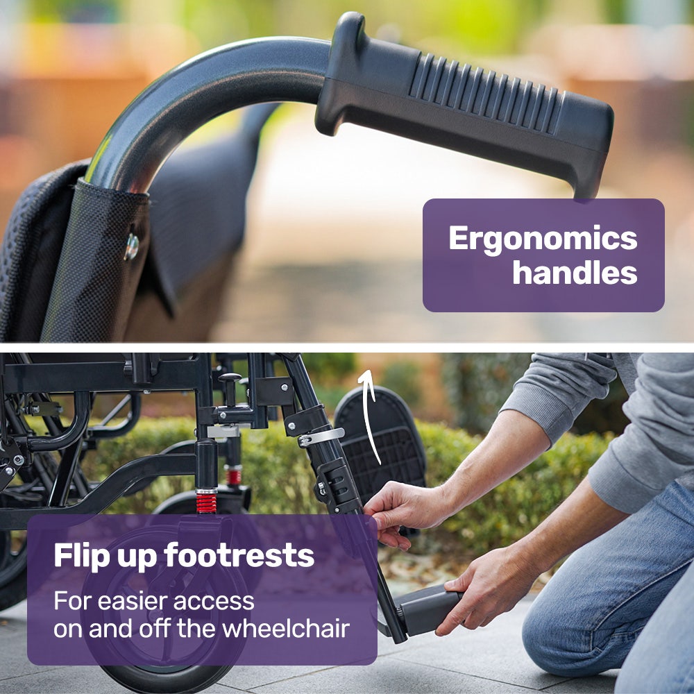 There are easily accessible mesh pockets under each armrest as well as a reading material pouch behind the backrest. Easily removable and machine washable seat and backrest cover for convenience.