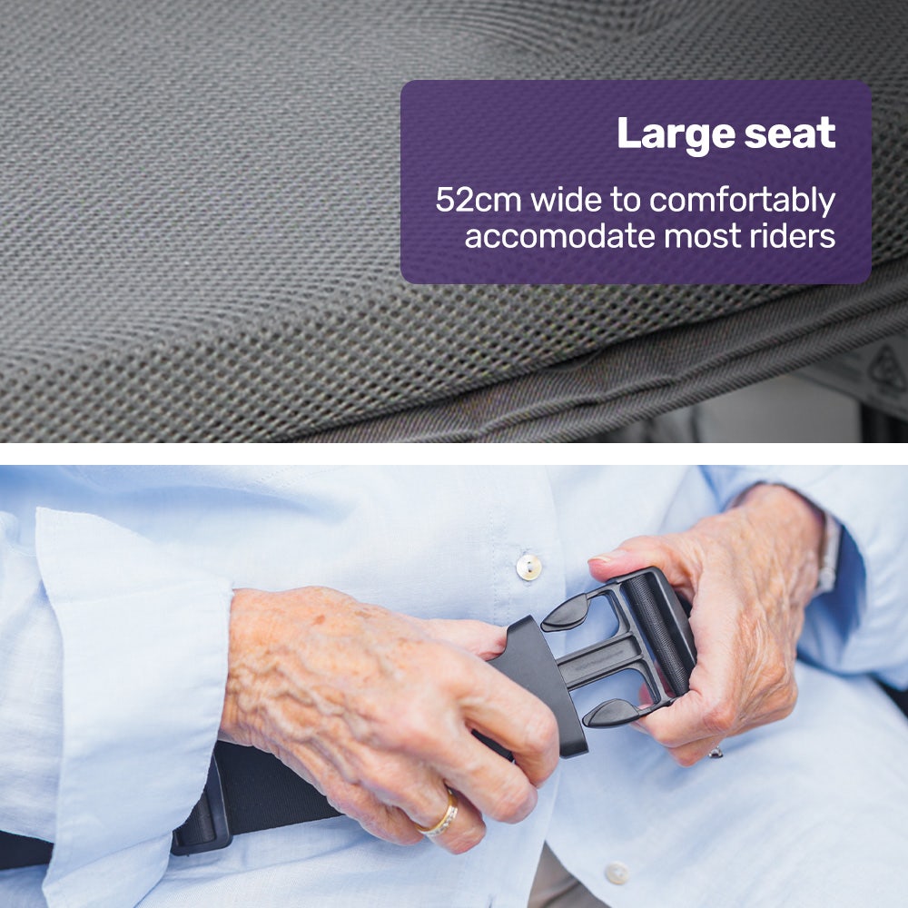 Ride in pleasure thanks to the thick memory foam seat and the padded backrest. A comfortable front and rear suspension system soaks up the bumps.
