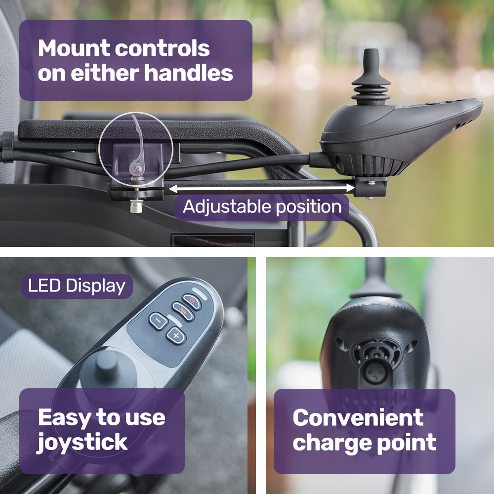 Steering is intuitive using the joystick that can be mounted on either the left or right-hand side, and with easy-to-read LED controls. You can travel along at a sensible speed of up to 6km/h, which is a brisk walking pace.