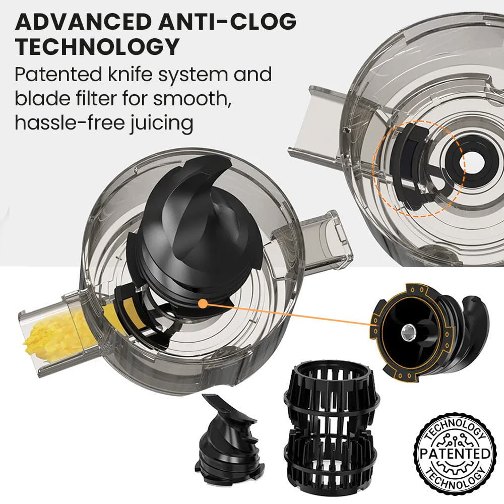 Advanced anti-clog technology, featuring a patented knife system and blade filter, ensures smooth, hassle-free juicing every time. The smart reverse function prevents blockages, and the juicers quiet operation, at under 70dB, makes it ideal for any time of day. With an included pulp container and juice jug, its perfect for small to medium batches.