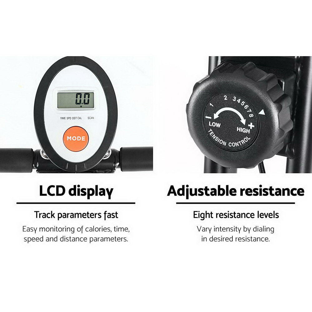Our Everfit Exercise Bike is a very efficient low-impact cross trainer that offers eight adjustable mechanical resistance to tone every muscle in your body. The easy-to-read LCD display lets you keep track of your training parameters. The durable powder-coated X-shaped steel frame is strong and sturdy and the large seat is comfortable with every stride. Other great features include soft V-grip handles, thumb lock, large and soft padded seat and adjustable seat height. Not least, the exercise bike also features a silent magnetic system that allows you to workout anytime of the day or night without causing any disturbance.
