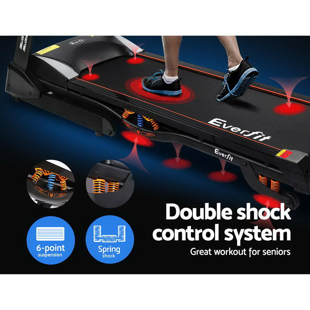 Compact and sturdy with its powder-coated steel frame, the Everfit Electric Treadmill allows you to perform essential cardio exercises within the comfort of your home. It features 12 pre-set training programs designed to simulate natural terrain. A user-centric control panel with a digital LCD display lets you set up to 18 speed levels and other monitoring parameters. Its linear power drive motor produces smooth and seamless operation and the anti-slip belt and soft-grip handle bar with pulse sensors make your session a comfortable and controlled experience. Other great features include a 15-level inclination adjustment, innovative double shock absorption system, automatic motor and belt lubrication, safety tether key and smooth wheels for easy mobility. Not least, the Treadmill is also equipped with a USB and MP3 connection, speakers, dual drink holders and a tablet holder for those who like to workout in style.