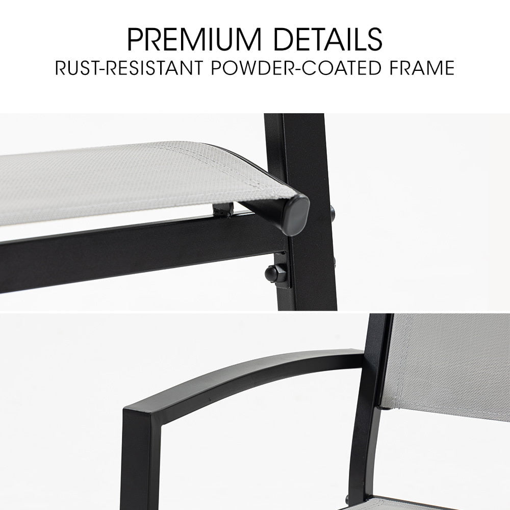 Designed for all climates, these chairs feature breathable fabric for well-ventilated comfort, fade resistance, and longevity. The strong, stylish, rust-resistant powder-coated frames and non-marking feet protect surfaces like tiles or decking.