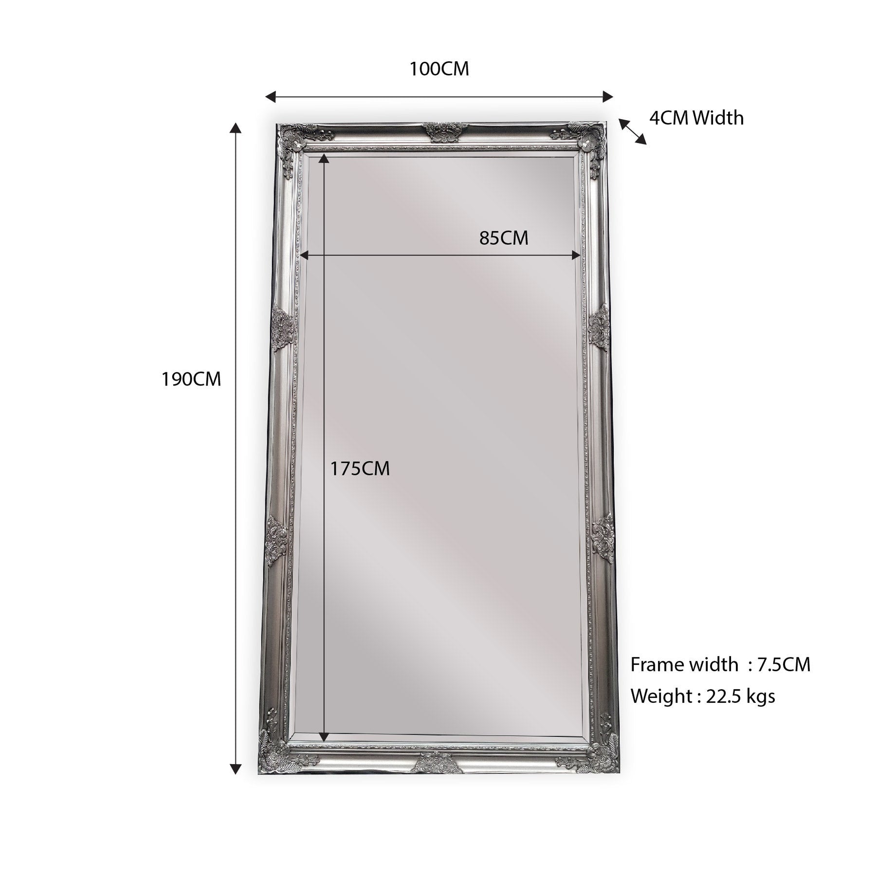 Total Mirror Dimensions: Length 190cm x Width 100cm x Depth 4cm
