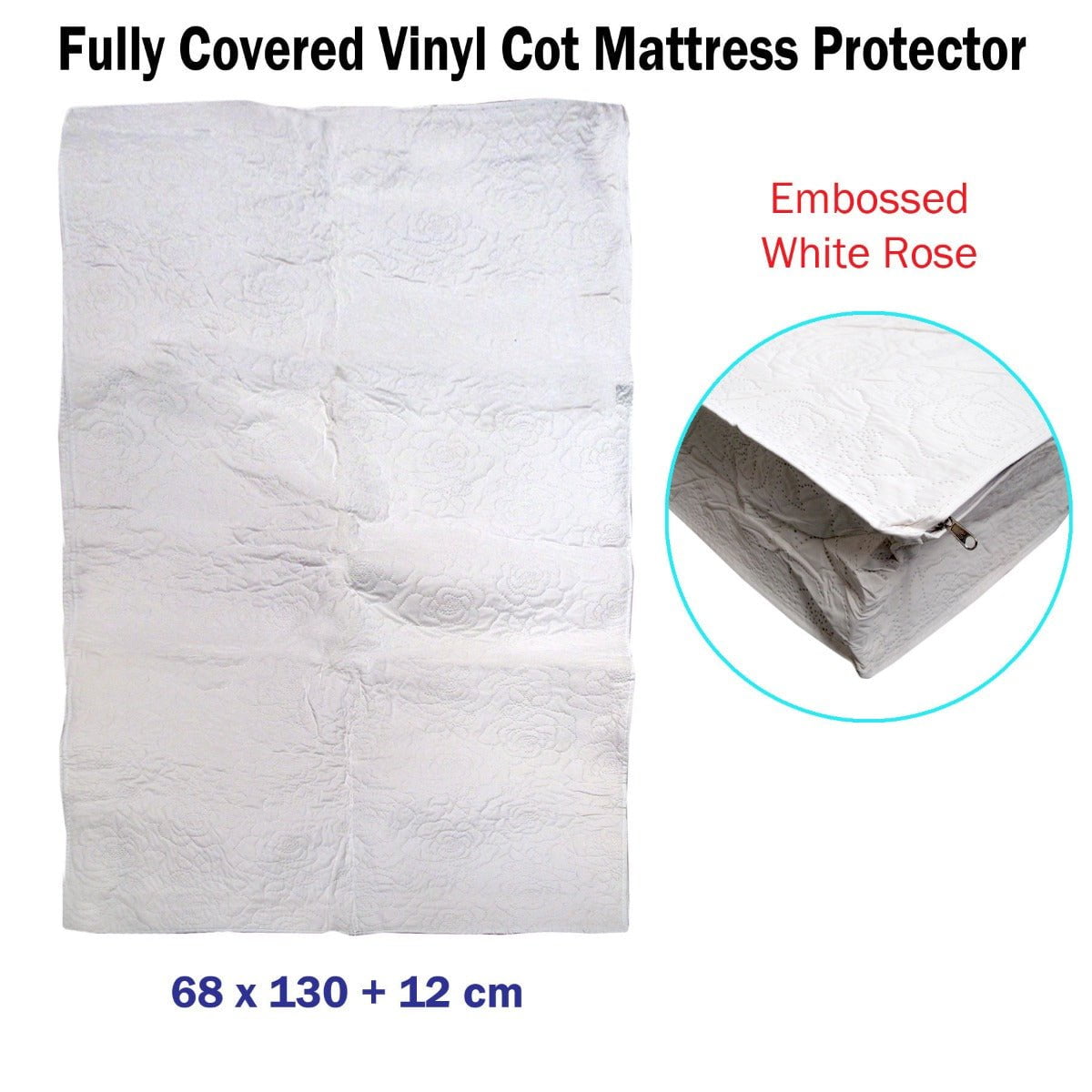 Fully Covered Vinyl Cot Mattress Protector Embossed Rose White 68 x 130 + 12 cm