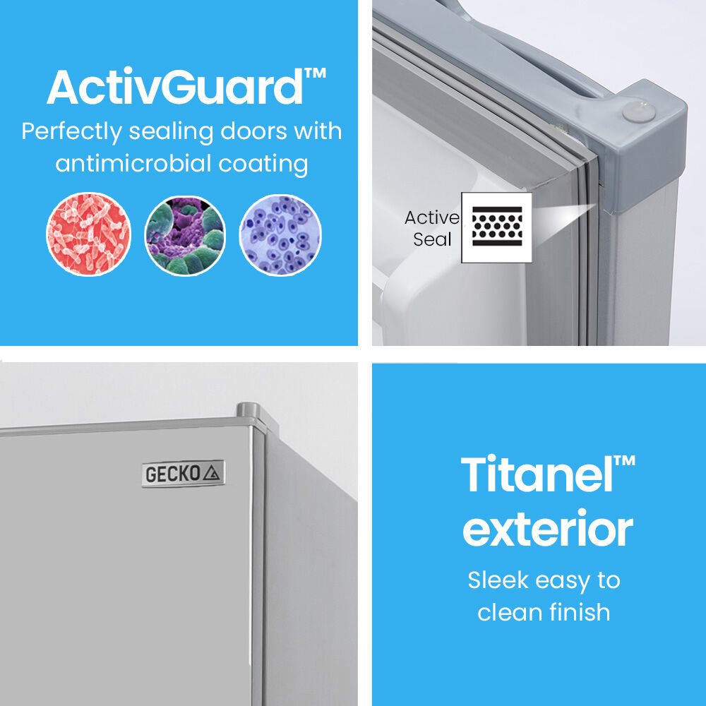 The Gecko Camping Fridge Freezer is designed to perform in harsh Australian conditions with quality compressor technology and thick insulation for fast cooling and operation in ambient temperatures of up to 38 degrees! The Gecko range features ActivSealTM technology which consists of perfectly sealing doors with an anti-microbial coating to inhibit the growth of germs. The Gecko also has flush recessed handles–a great feature for confined spaces. All this is wrapped in a sleek TitanelTM metal finish, ensuring it will look right at home, anywhere!