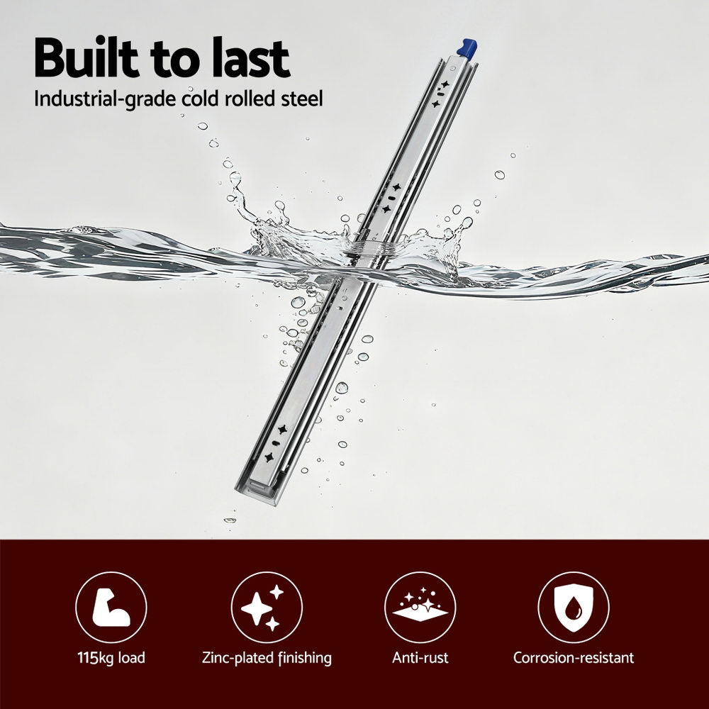 Enhance your storage setup with the Giantz Heavy-Duty Drawer Slides, engineered for superior performance and durability. Available in a range of lengths from 450mm to 900mm, these slides can handle a substantial load of up to 115kg, making them perfect for your toughest projects. Whether it's a UTE toolbox, a camper trailer's storage, or a 4WD cargo system, or household cabinets, these slides provide reliable support. Experience effortless operation with the precision ball bearings, ensuring a smooth and silent glide every time. The integrated nylon buffer design offers a soft and quiet close, while the optimized PP triggers make locking and unlocking simple and safe. Built from thickened zinc-coated cold-rolled steel, these slides are designed for a long lifespan, capable of withstanding over 50,000 opening and closing cycles. The lock-in/lock-out design ensures your drawers stay securely in place on uneven ground. With full extension, you can easily access items at the very back of your drawer, maximising your storage and convenience. Upgrade your drawers with Giantz and enjoy a combination of strength, safety, and smooth functionality.