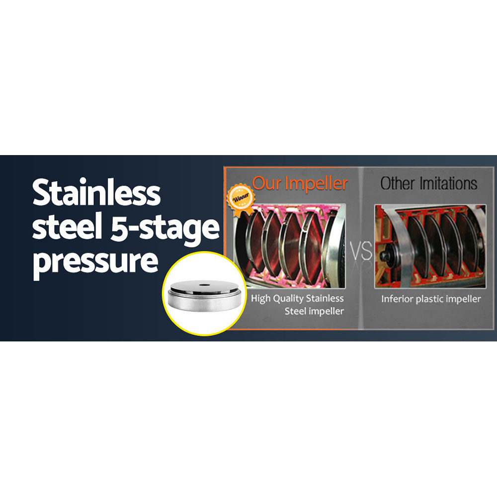 When low water pressure gets you down, power it up with our Giantz 5-stage Water Pump. It is the perfect solution where constant on-demand water pressure is needed at the open and close of any tap. You will find our water pump particularly useful for homes, household gardens, farms, commercial entities or any situation where pressurised water is consistently required. The water pump features an IP-rated commercial motor, full stainless steel pump body, cast iron ends, 1.25‘’ inlet and 1‘’ outlet ports, corrosion-resistant brass connectors, efficient cooling system and not least, built-in thermal protection. Pumping out at a rate of 150L/min with a 60m head, the 2000W water pump can send water up to two stories high effortlessly. You can also accurately control the pressure to your precise requirements with the fully automatic controller and monitor it at a glance of the pressure gauge. Power to the pump is as simple as plugging it straight into any Australian standard socket. Whether you are using the pump as a permanent installation or on an ad hoc basis, you can be assured of dependable and reliable water supply in more ways than one.