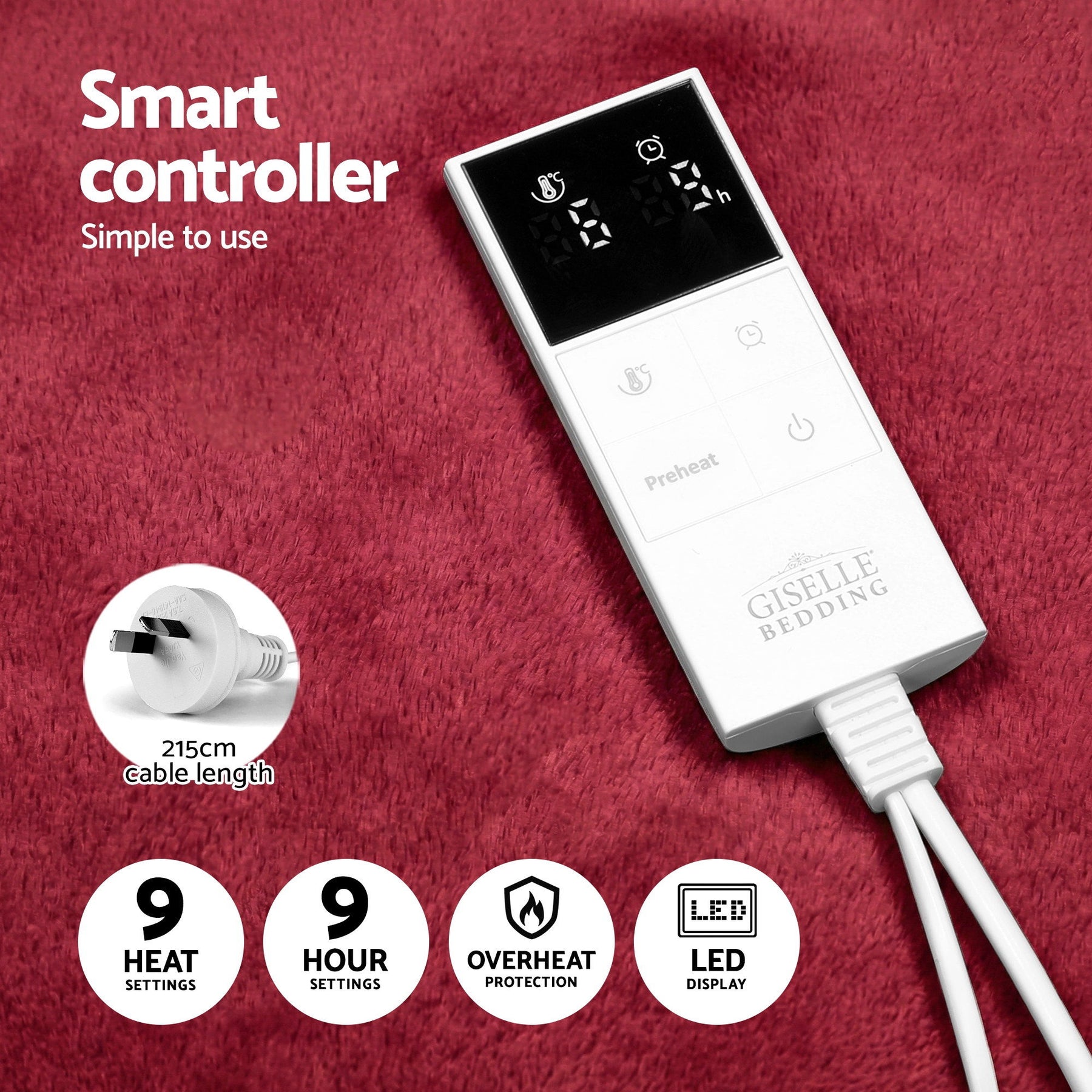 Get that warm and cosy feeling every day with a Giselle Bedding Electric Throw Rug. The double-sided throw rug is made from premium flannel and sherpa fabric, our electric throw rug is just the thing to help you cut down on costly heating bills while still enjoying the heat up-close. The throw rug has all the features of our electric blankets with up to 9 temperature settings, a 9-hour timer, overheat protection, automatic shut-off and a detachable controller with LED display so you can always be in control of the temperature. It is machine washable for a clean blanket time and time again. Keep your bedroom or living room cosy and comfortable with a warm and huggable Giselle Bedding Electric Throw Rug.