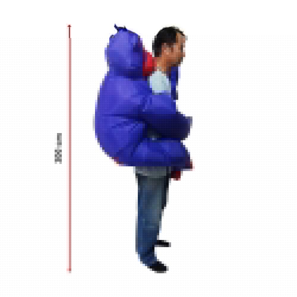 This durable, one-size-fits-all costume is constructed of an extremely light polyester material called terylene. This high quality material keeps you cool and free of perspiration. Included with the costume is a compact fan unit that keeps the costume inflated and never lets it droop. The battery pack clips to your pants or belt under the costume. The batteries will keep you inflated for at least several hours.