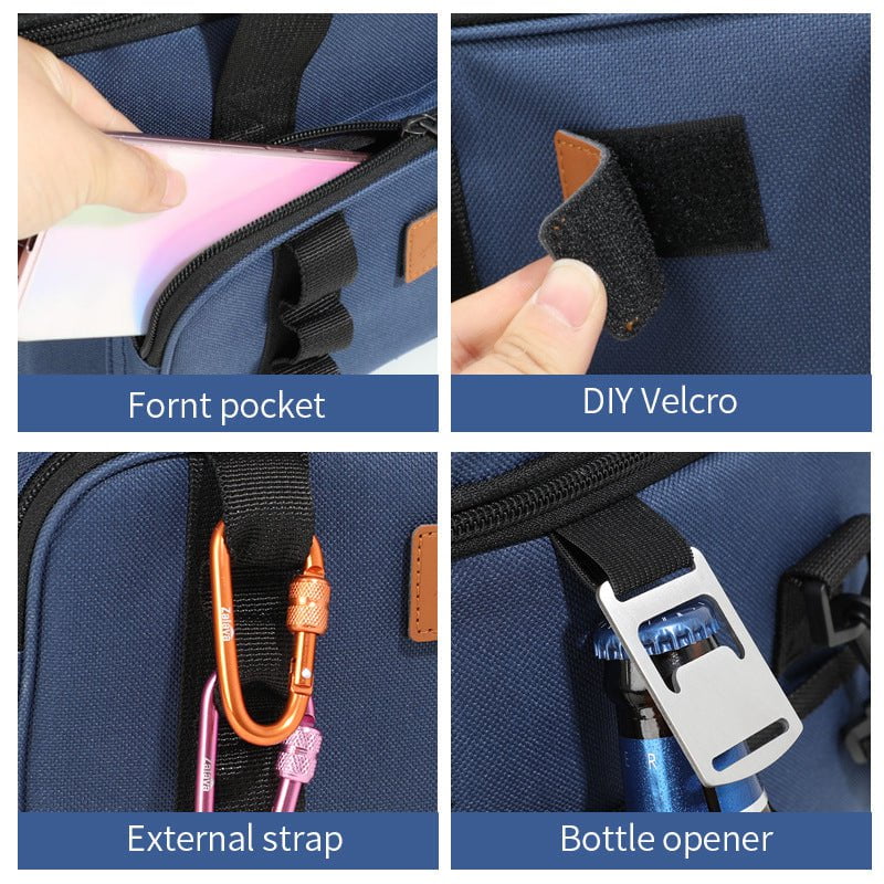• Convenient Features: Equipped with a bottle opener, side pockets, a front pocket, and an external strap for additional storage and functionality.
