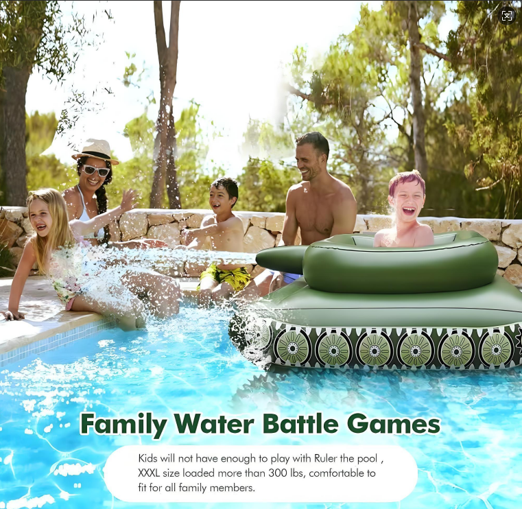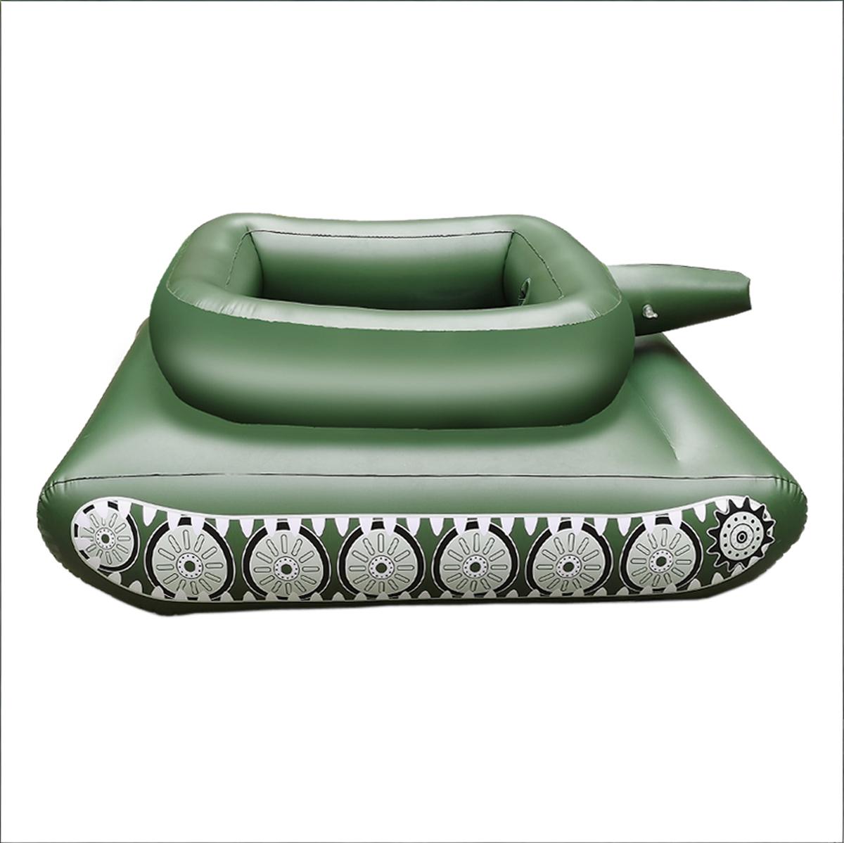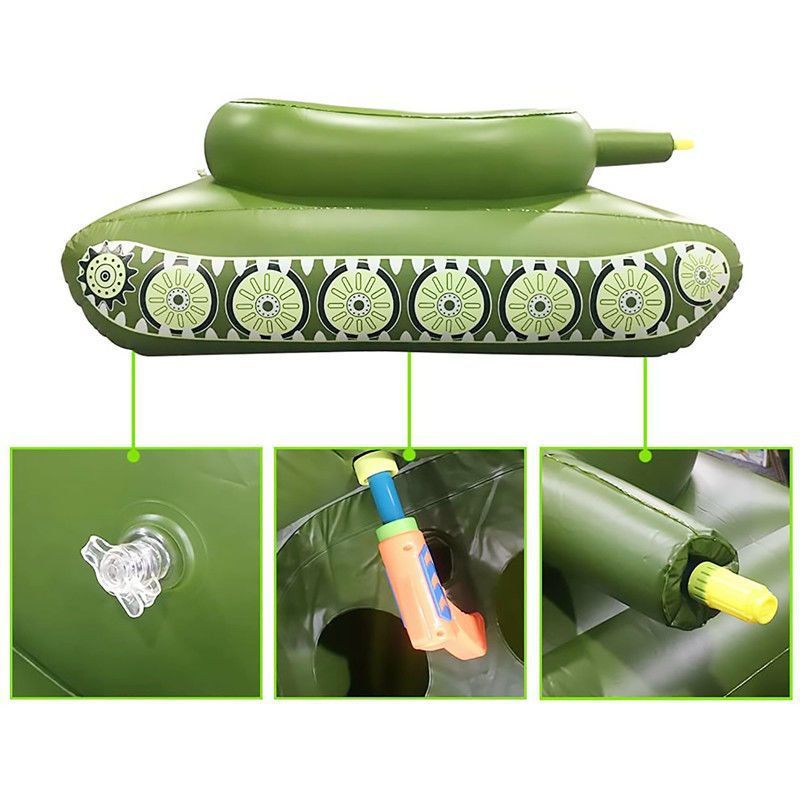 Dive into action-packed summer fun with thisinflatable water tank floatdesigned for both kids and adults who love playful pool battles! Shaped like a realistic military tank, this vibrant green float lets riders of all ages command their own aquatic battlefield. The integrated spray cannon connects to a high-pressure water gun that draws directly from the pool, delivering continuous streams for thrilling water fights without refilling. Built with extra-thick, puncture-resistant PVC, it offers durability through rough play and long-lasting use in pools, lakes, or beaches. The roomy cockpit comfortably supports up to 300 lbs, making it perfect for teens, adults, or parent-child duos. Ergonomic seating ensures stability while floating, so you can focus on strategy and splashing! Easy to inflate with any standard pump (not included), it deflates flat for compact storageideal for travel to backyard parties, resorts, or lake trips. Whether youre hosting a birthday bash, enjoying family time, or just cooling off with friends, this imaginative float sparks laughter, creativity, and active outdoor play. Its bold green color and detailed tank design make it a standout centerpiece at any pool party.