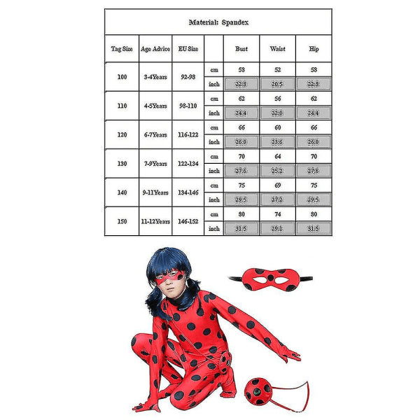 - Kids Girls Cosplay Set Halloween Costume Material: Polyester+Spandex. Kids Size: 110 (100-110cm), 120 (110-120cm), 130 (120-130cm), 140 (130-140cm), 150 (140-160cm), 1 (150-160cm). Complete Key Chain Set-- The package includes a key chain costume, a matching wig, an eye mask and a bag. Transform your little one into the real character suddenly when your kids dress up in this key chain costume. Superior Material - This key chain costume is made of 5% spandex 95 polyester blended fabric, stretchy, comfortable, breathable for kids to wear. The accessories are well-made and long-lasting. Print-- The set has a digital print, the base material is white with red/black print on it. So when you pull the set wide to fit, it is normal for the base to show a little. Great help to develop children's independence, self-reliance and personality strength. Perfect for Halloween costume, ladybug theme birthday party, carnival, Christmas gift for kids, daily dress-up role play and more. _tfrf