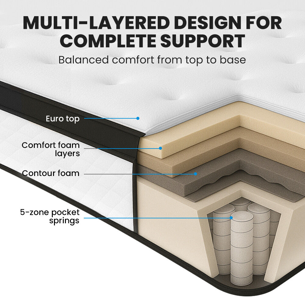Beneath the surface, a 5-zone pocket spring system is engineered to respond to your body's unique shape. Targeted support zones cradle the shoulders, back, hips, and legs, helping maintain spinal alignment while reducing pressure points. Individually wrapped springs move independently to absorb motion-minimizing partner disturbance and supporting deeper, uninterrupted sleep.