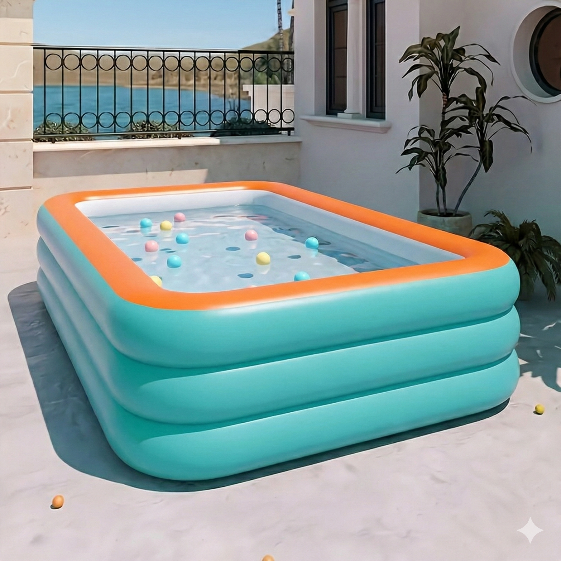 The pools rectangular design maximizes usable space while maintaining structural integrity. With its deep sides, it provides enough depth for enjoyable swimming and splashing. It's easy to inflate and deflate using a standard electric air pumpsetup takes just minutes, and storage is simple when deflated. For added safety, we recommend filling the pool to no more than 75% of its capacity to maintain balance and prevent tipping.