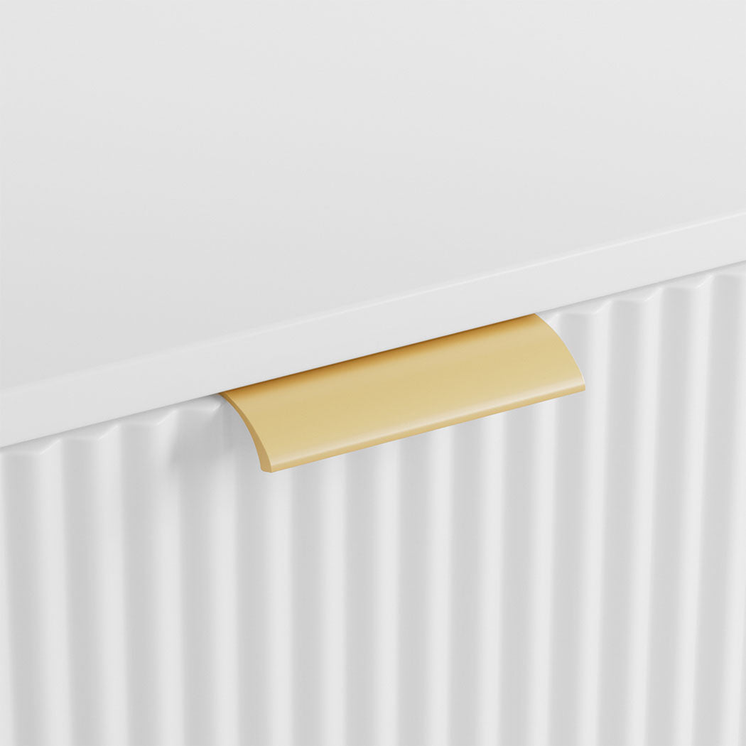 This modern white coffee table brings an elegant touch to any living space. Crafted with a smooth wooden board and accented with gold metal handles and legs, it exudes a luxurious yet versatile charm. One side features a spacious drawer with a fluted design, perfect for storing essentials, while the other half offers an open shelf for easy access to decorative items or books. The table is thoughtfully designed with rubber feet mats to protect your floors from scratches. Its clean, sleek lines make it a perfect addition to any contemporary home.