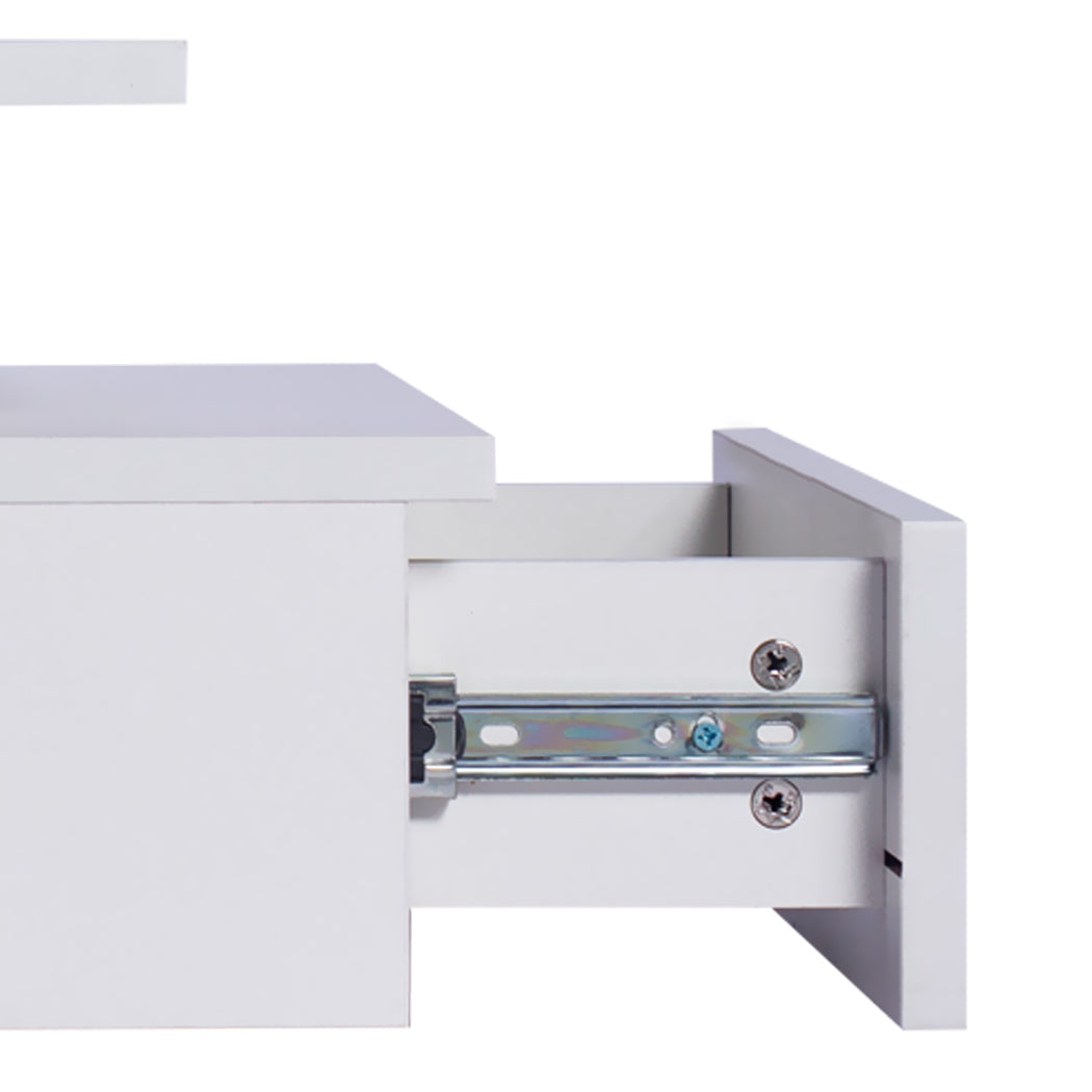 Our Levede bedside table designed to be mounted on the wall is sure to garner admiration. Its wood construction ensures years of reliable use. It comes with LED light. Not only will the table create a beautiful ambience, it will also save you from buying extra bedside lamps or nightlights. Better still, the handle-free design gives it a modern vibe that stands out from the mundane. Quality made with 15mm thick melamine particle board, the bedside table is durable and easy to maintain. Choose from one or two to lighten up your dreams in more ways than one!