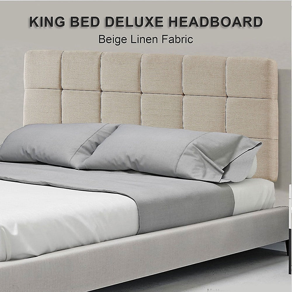This headboard for standard King-sized bed frames is created with quality materials, including easy-to-maintain Linen Fabric that will maintain its sophisticated look for many years to come. This particular model comes with elegant stitching accents that provide just the right level of understated pop. A neutral beige will blend seamlessly with a wide variety of bed frames and other bedroom furniture.