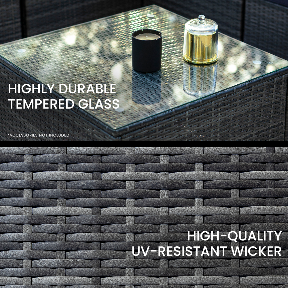 The set includes ultra-comfy 8cm thick water-resistant seat cushions, generous backrest cushioning and 2 premium throw cushions. The high-quality UV-resistant handwoven Suntech wicker in Marl Grey weave has a premium natural textured look. This is a modular design comprising three sofas, two corner sofas, plus a coffee table with tempered glass table top. You can set it up in whatever configuration works best for you, making this London Rattan outdoor lounge setting a great addition to any outdoor space.