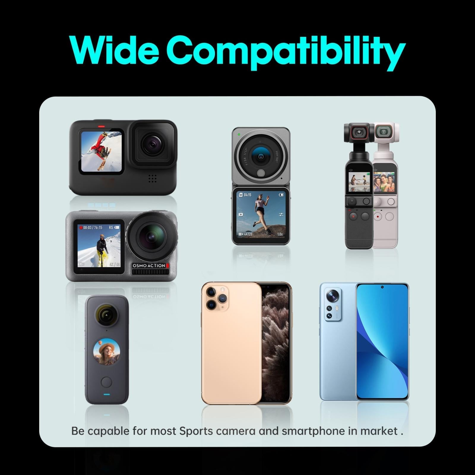 • Applicable to a variety of devices, shipped with a foldable mobile phone clip, 1/4 adapter, suitable for DJI Action 2/ OSMO Action /FIMI PALM 2 / FIMI PALM / GoPro HERO8/9/10/11/Insta360 ONE/ONE X/ONE X2/EVO and other cameras