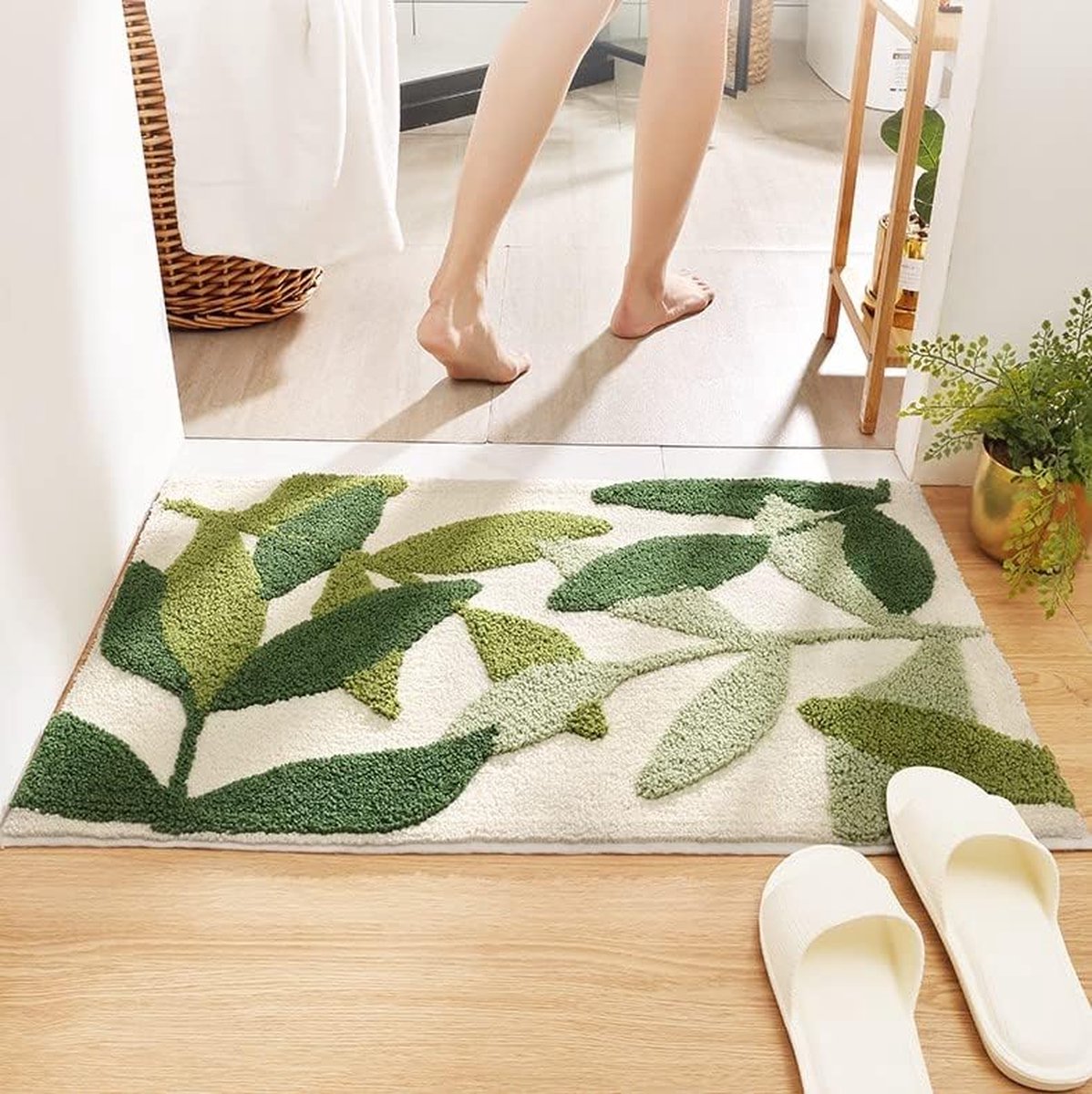 【HIGHLY ABSORBENT】Our bathroom rugs help keep your feet dry with their special technology. You don't have to worry about your bathroom and floor moisture being absorbed by the bath mat thanks to the high-quality microfiber materials. Only place bath mats on a clean, dry floor and test the mat with your foot to ensure it doesn't move before use. TIPS: The bath mat may not offer optimal slip resistance on uneven tile floors. 【SPECIAL MOOD】A bathroom rug full of green leaves will help change your good mood. A durable and comfortable bath mat is a better choice, and then you can enjoy the good mood of the green leaf bath mat every day with a fresh feeling. 【EASY TO CLEAN】Our bath mat is easy to clean. A washing machine cleans the rug. The bath mat won't fall off during use or washing thanks to the high-quality fiber lock technology and durable material.