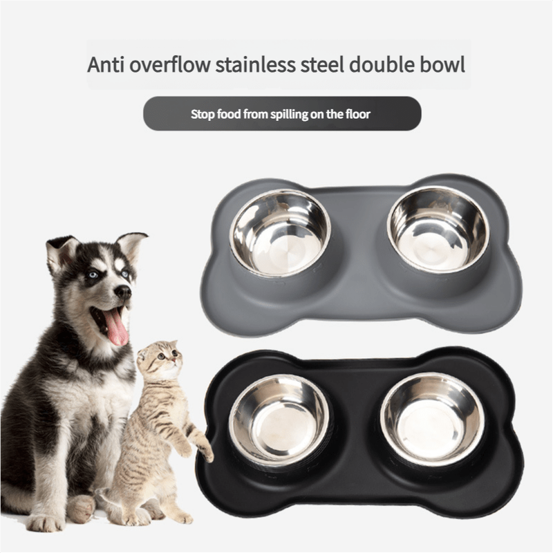 Non-Slip Stainless Steel Double Pet Bowl Set - This durable and convenient pet bowl set is designed to make feeding time easier and cleaner. The two stainless steel bowls are perfect for food and water, while the silicone bone-shaped mat keeps the bowls in place and prevents spills. The non-slip mat ensures the bowls won't move during mealtime, reducing messes on your floor. This set is ideal for both cats and dogs, and the bowls can be easily removed for cleaning.