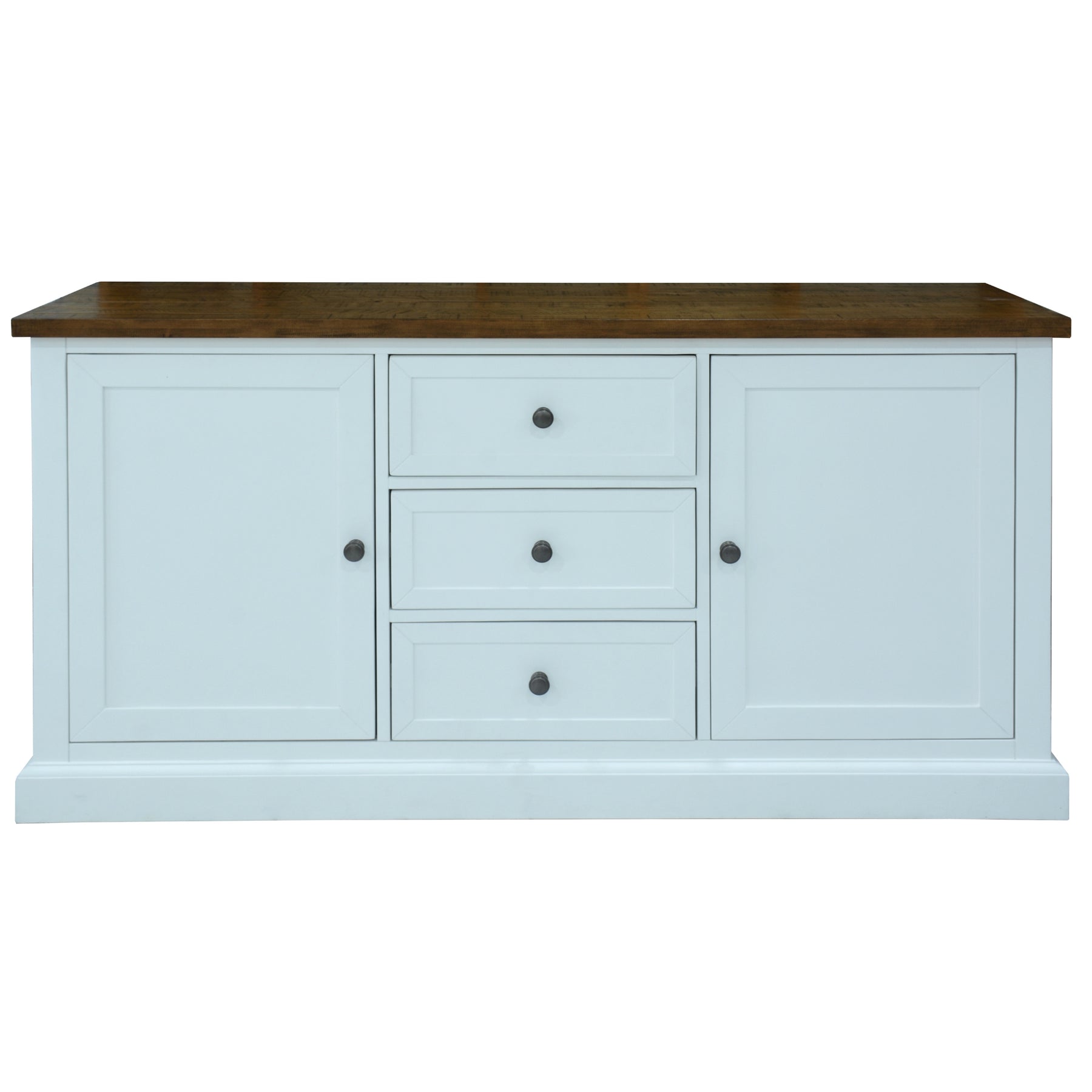 This delightful buffet will solve your storage space problem forever and add refined beauty to your living area. The 2-door, 3-darwer buffet is designed beautifully in the Hampton style and looks exceptional as its construction features two colours—a natural top and a white painted base. With a rough swan finish on the top, it shines among other furniture pieces. The drawers are on full-extension metal runners, and the doors have adjustable hinges for perfect alignment. The door and drawers have metal handles in antique colour. The structural frame of the buffet is made of solid acacia wood, while its top is solid pine. It is eco-friendly furniture, as the wood has been obtained in a sustainable manner. The high-quality wood makes the buffet strong and durable. A one-year warranty is included with the fully assembled buffet.