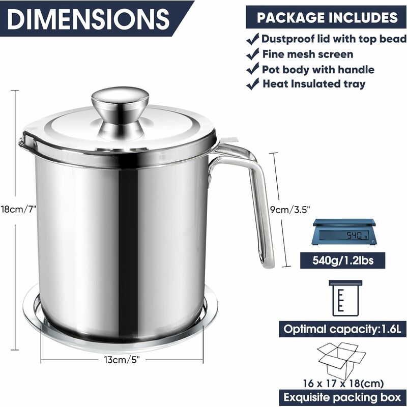 - Perfectly designed cooking oil container: A tight-fitting lid to keep the filtered oil and prevent dust from falling inside