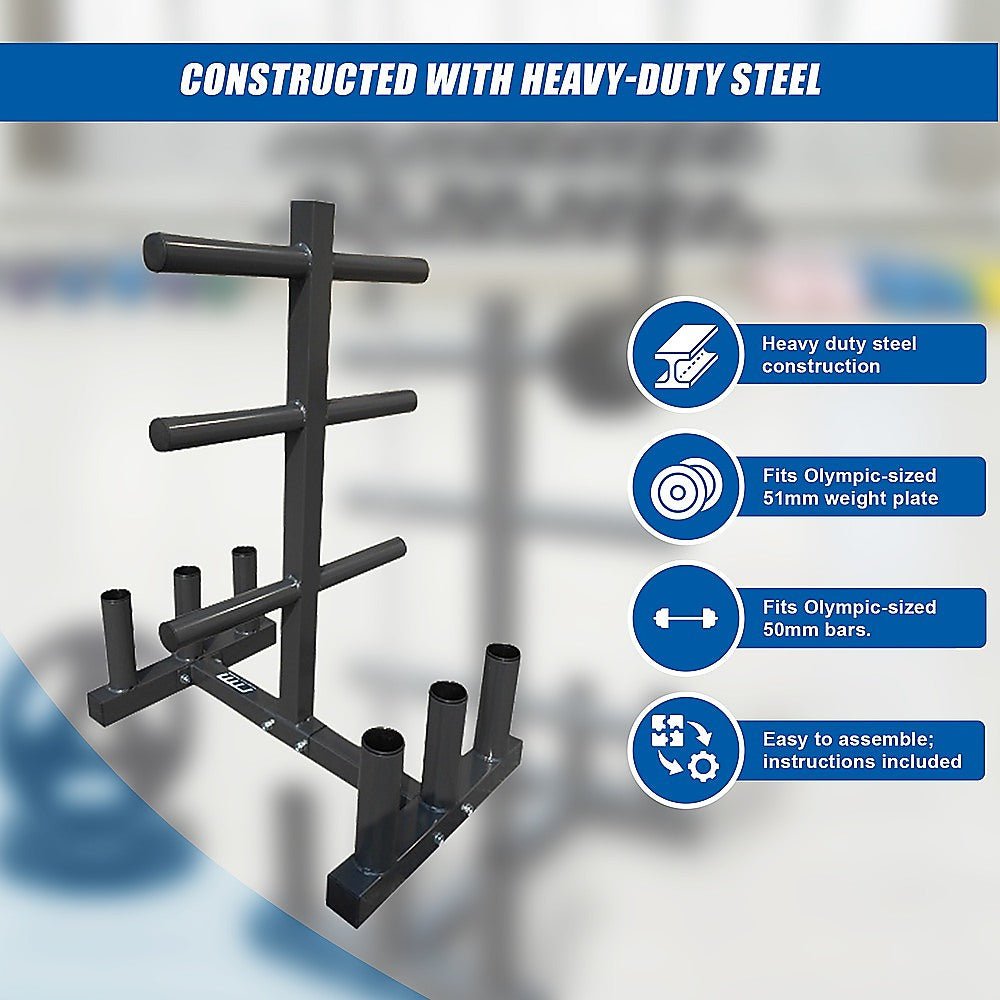 The rack accommodates Olympic-sized 51mm weight plates and 50mm Olympic bars. There is room for multiple plates on each of six weight plate spokes. Even better, six additional outside spokes give you a convenient place to store standard-sized gym bars.